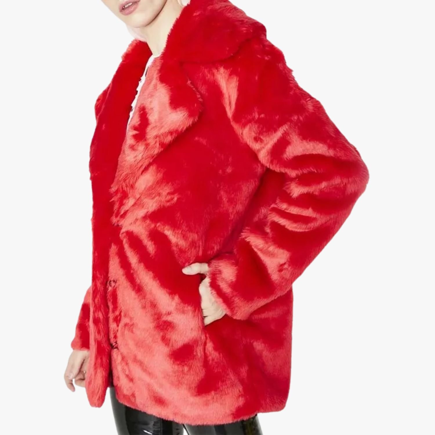 To dress up the jacket, layer it over a sleek dress or a tailored outfit. The vibrant red color and faux fur texture add a touch of sophistication, making it suitable for evening events or special occasions. Opt for elegant accessories, such as statement jewelry or high heels, to complement the jacket’s luxurious feel.