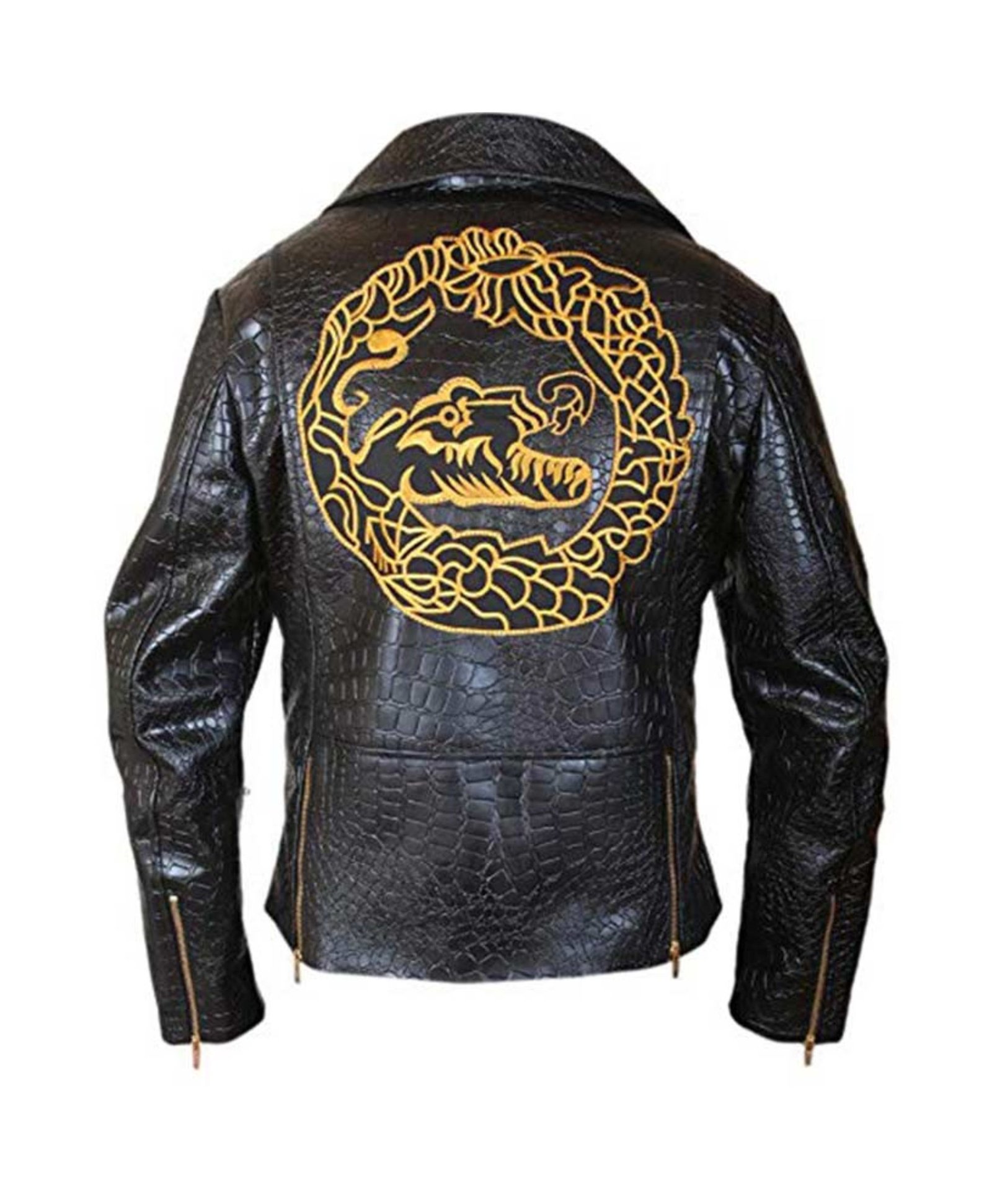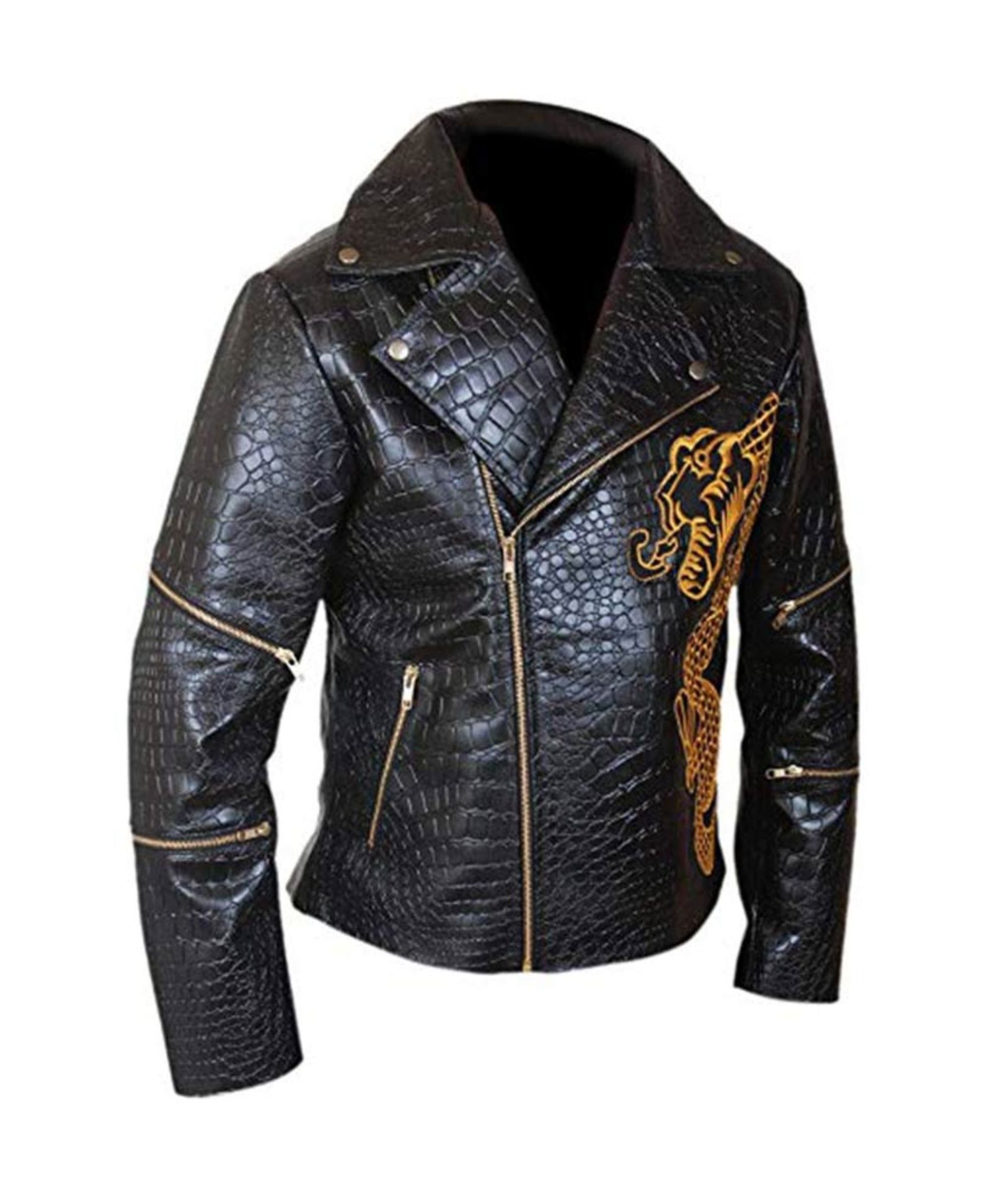 The jacket from the Suicide Squad is made of high-quality synthetic leather. It has a lapel-style collar and an overall golden zip clasp in the front. The primary feature has an embroidered patch of a dragon. That has nicely done on both the front left side, and the rear. Grab this fantastic dragon-style jacket and wear it for cosplays, parties, or just as casual attire. It has two zip pockets on the waist area and two inside.