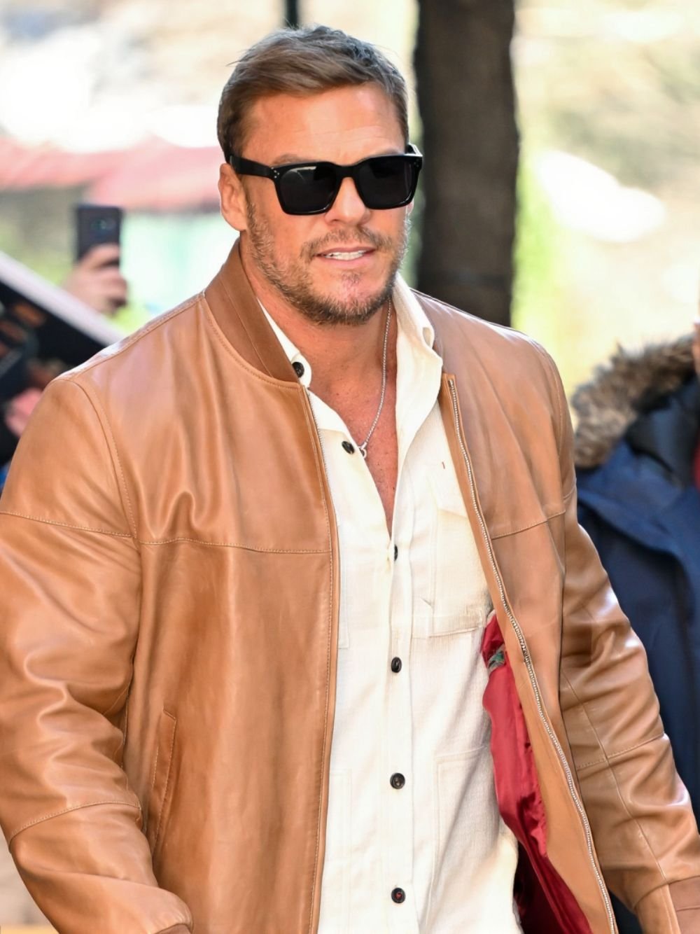 Alan Ritchson Ordinary Angels 2024 Ed Schmitt Brown Leather Bomber Jacket