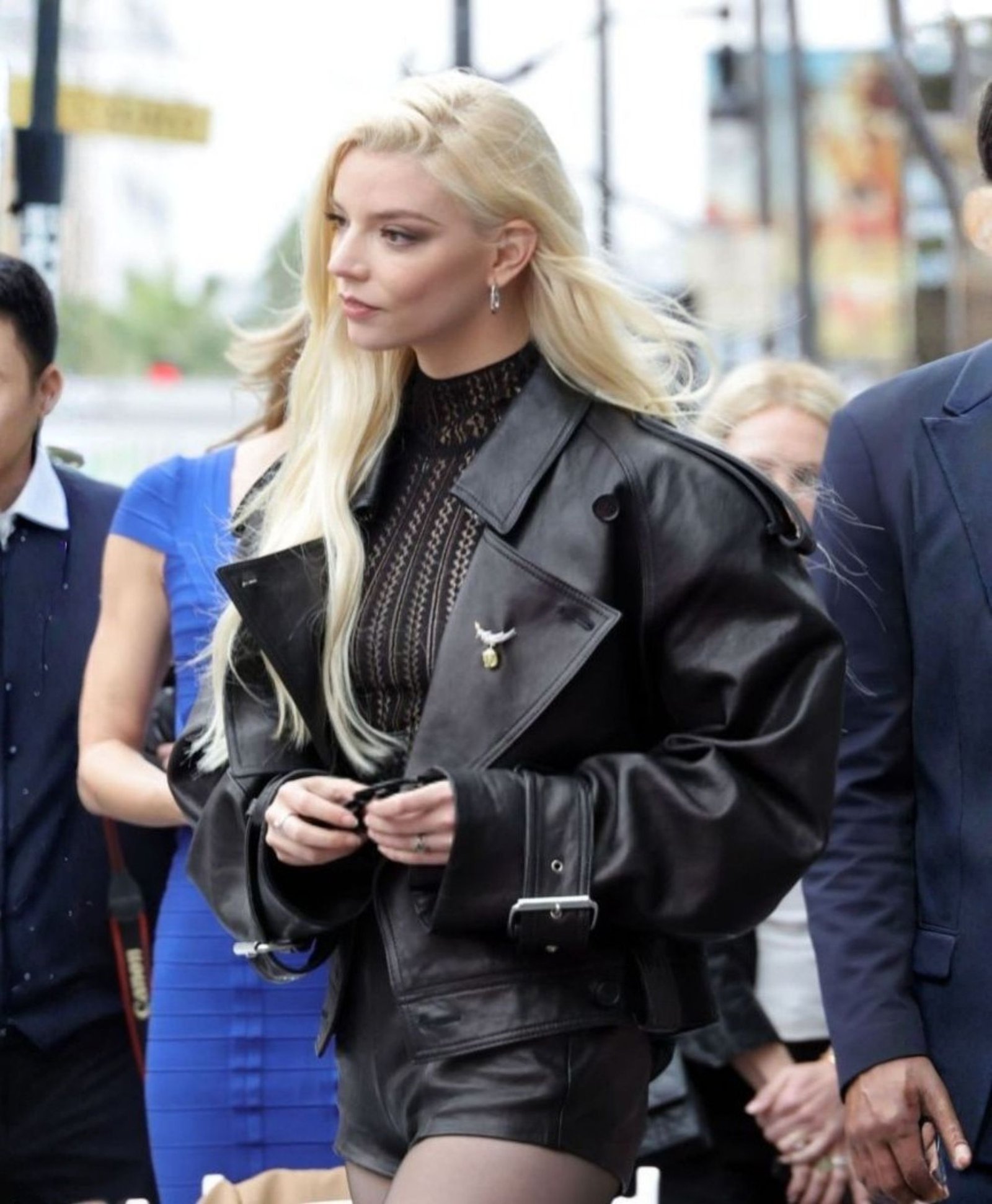 The Anya Taylor-Joy Black Biker Leather Jacket is a masterclass in silhouette and structure. By moving away from heavy zippers and hardware, this design focuses on the elegance of the leather and the precision of the fit. The buttoned front closure provides a classic, almost blazer-like aesthetic, while the integrated waist belt allows you to customize the tightness to highlight your natural frame.