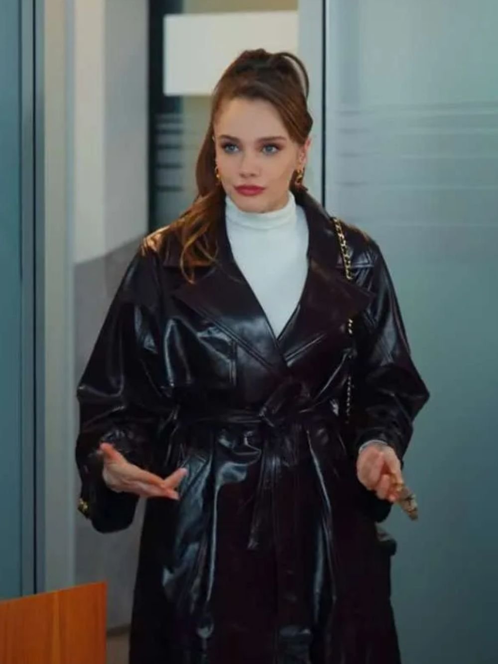 Miray Daner TV Series As the Crow Flies S02 Asli Tuna Black Leather Trench Coat On Sale