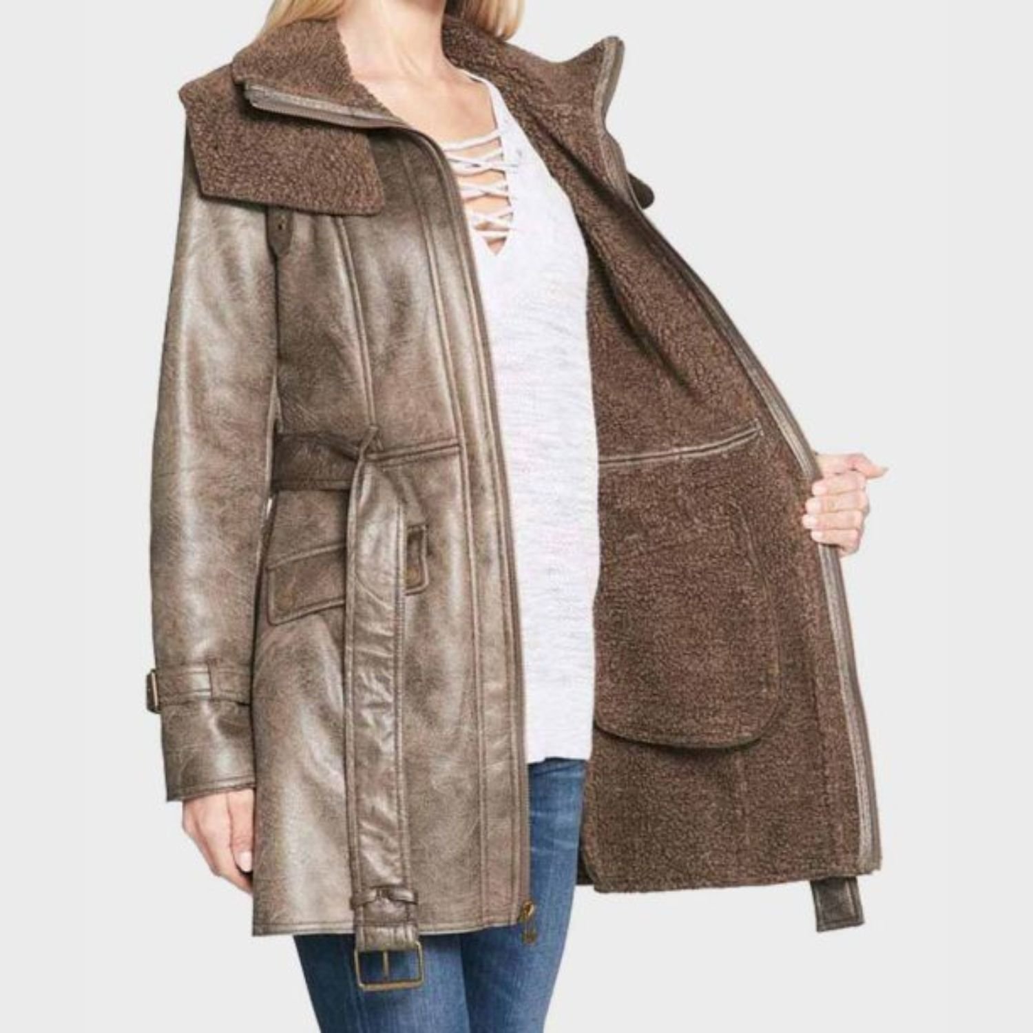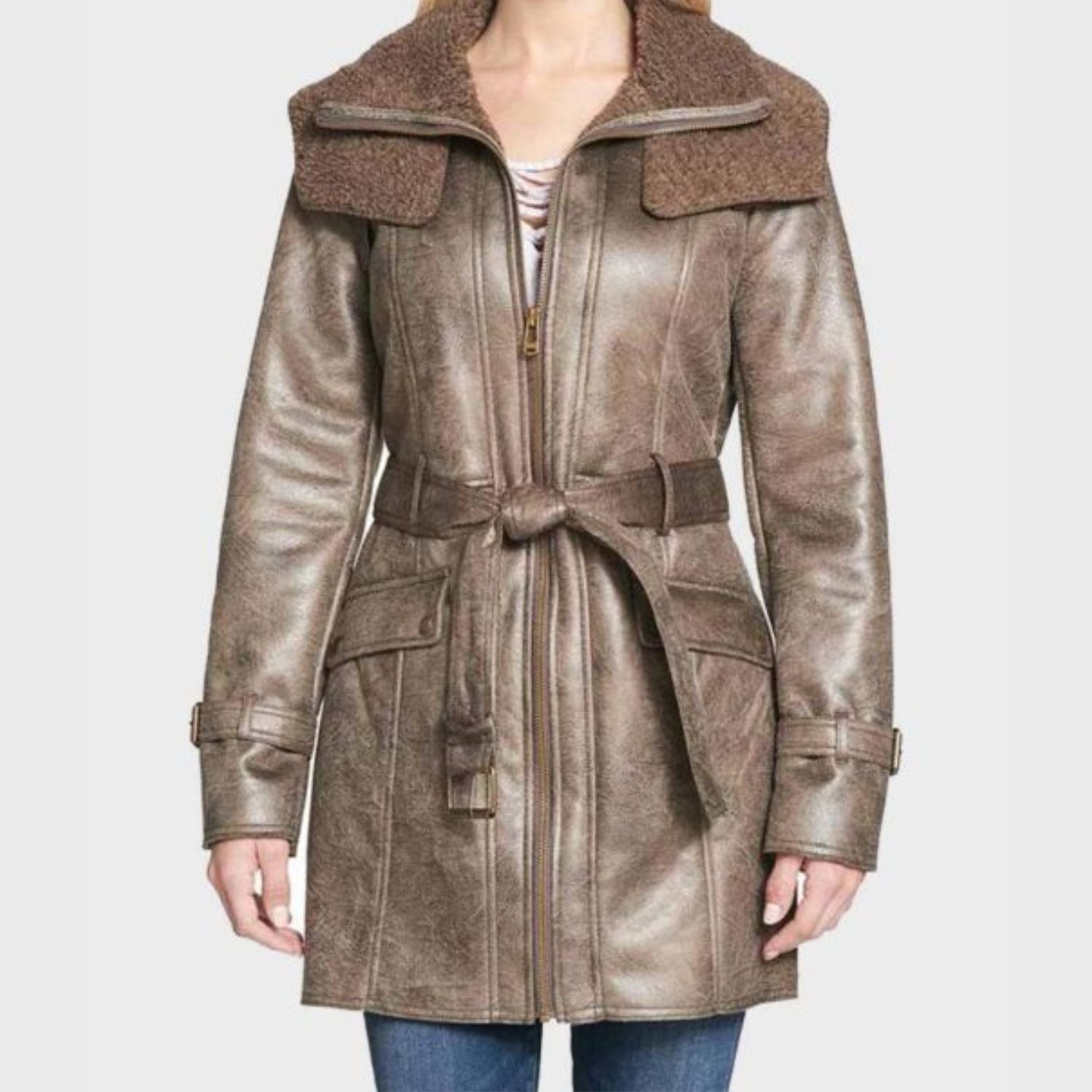 Women’s shearling mid-length duster leather coat has a wide lapel style collar with an extra layer of shearling on the shoulder for extra warmness and calmness. Moreover, it has two buttoned flap pockets on the waist and two inner pockets to keeping stuff with you. This coat is for all ages group. Women’s shearling mid-length coat has full-length sleeves and open hem cuffs. Plus, an adjustable belt is designed on the cuffs, which intensifies the coat’s look. It has a brown color, and it is available in all sizes, so go and get it now.