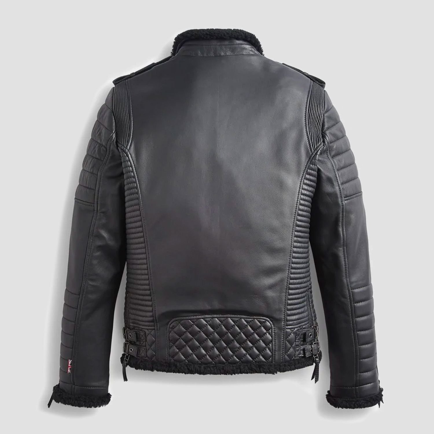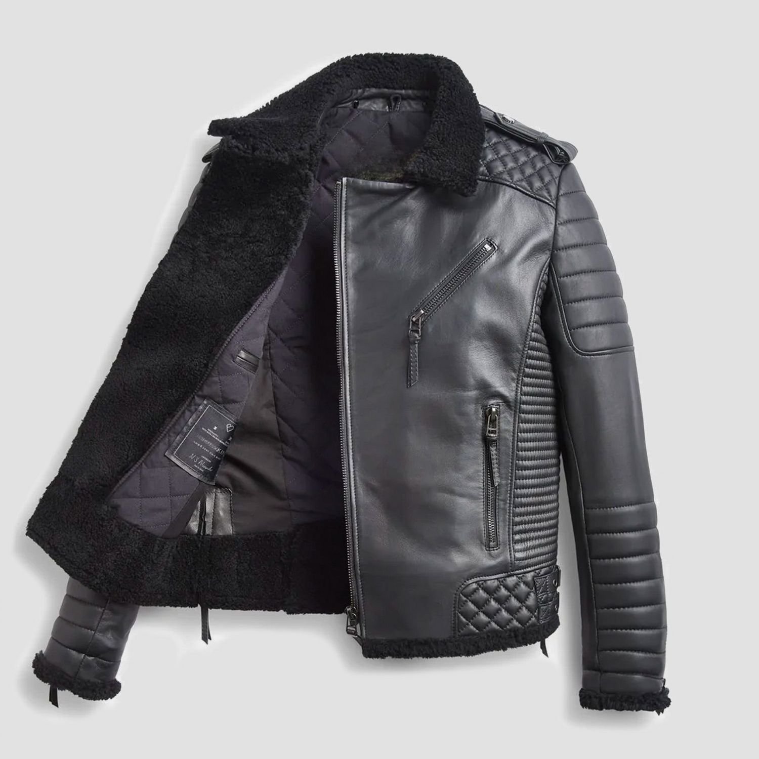 Unleash a new standard of winter sophistication with the Benjamin Biker Padded Quilted Shearling Jacket, a high-performance garment that merges the aggressive energy of motorcycle gear with the opulent warmth of a premium aviator. This jacket is meticulously constructed from 100% genuine leather, finished in a deep black that radiates a sleek, modern aesthetic. The exterior is defined by intricate padded and quilted detailing across the shoulders and panels, providing a structured, muscular silhouette that sets it apart from standard leather coats. These reinforcements are not only a visual tribute to traditional biker armor but also add an extra layer of durability and wind resistance, making this jacket a formidable choice for those who navigate harsh urban climates.