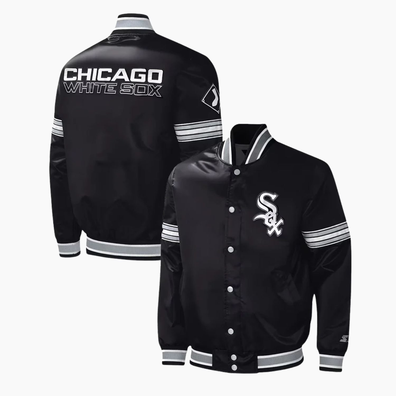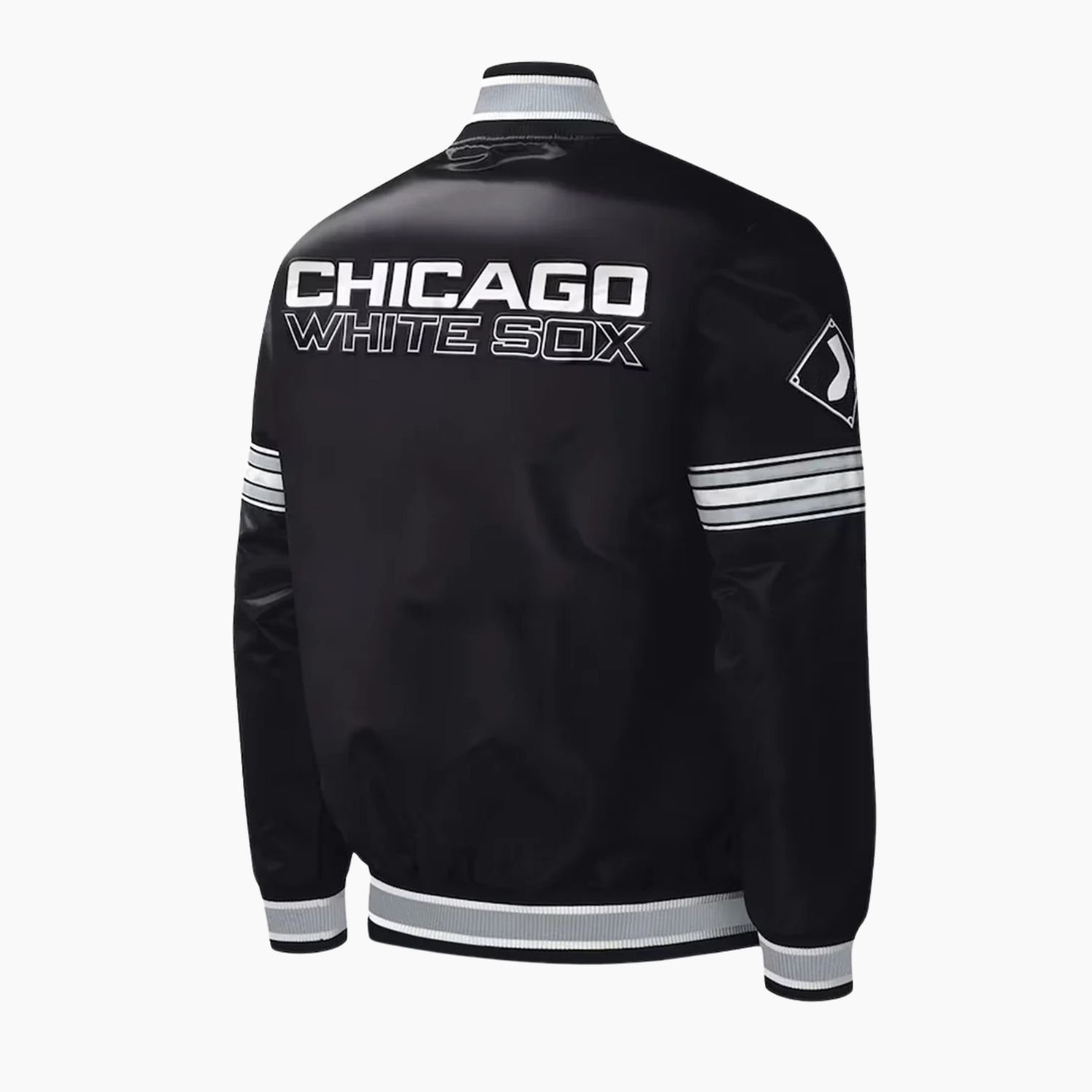 Celebrate your team spirit with the Black Chicago White Sox Midfield Satin Jacket, a must-have for fans and streetwear enthusiasts in the USA. Crafted from 100% high-quality polyester, this jacket is lightweight, durable, and easy to maintain. The bold embroidered graphics on the front and back showcase your love for the Chicago White Sox in style.