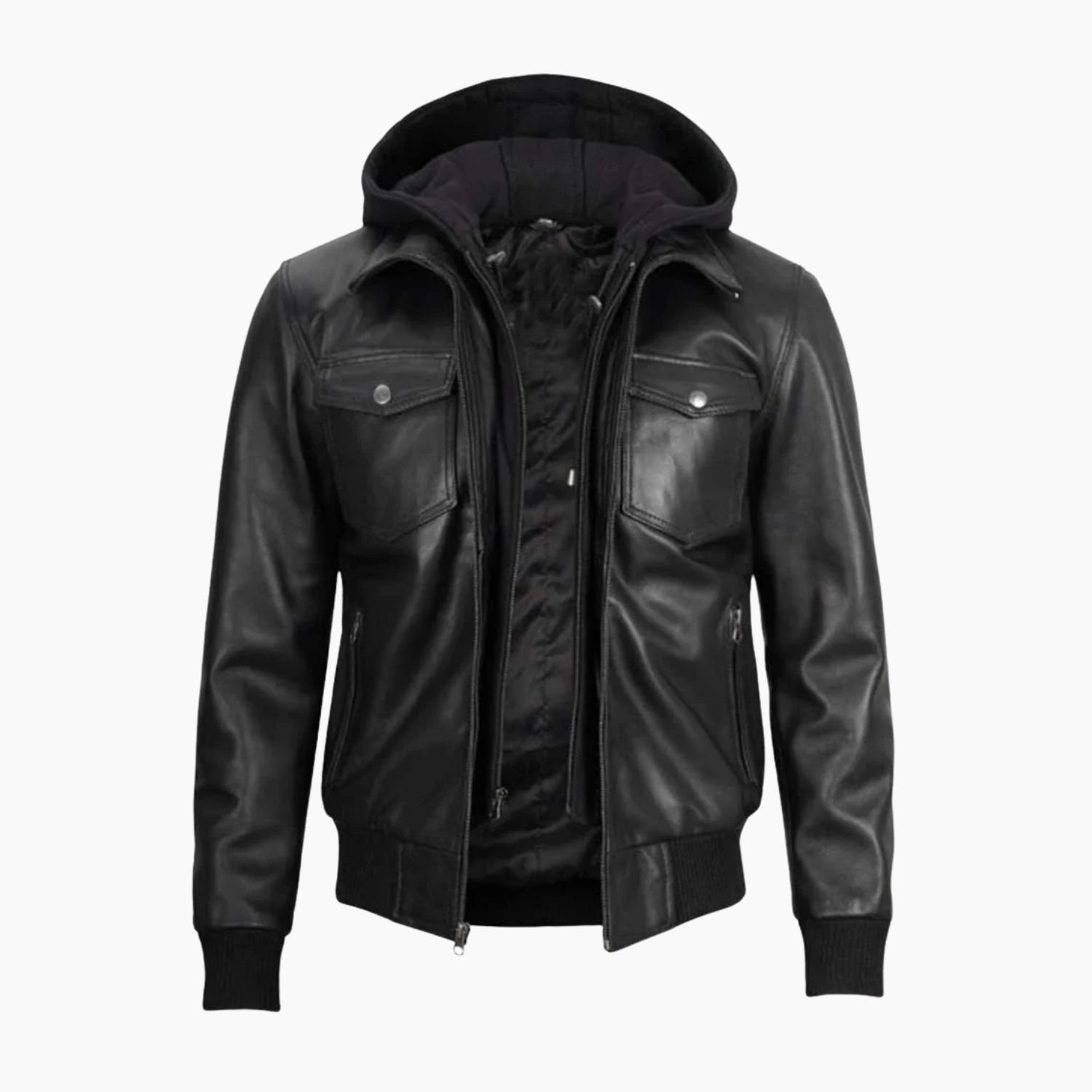 Black Mens Leather Bomber Jacket with Hood