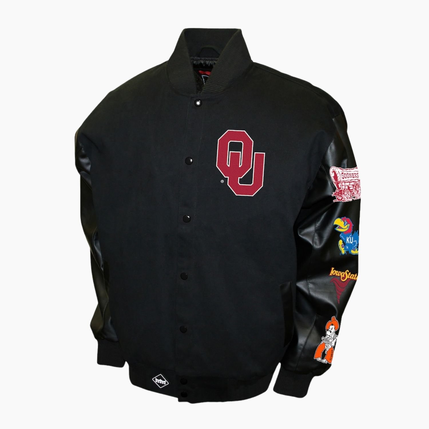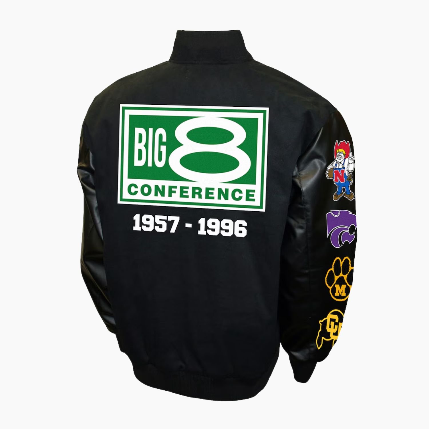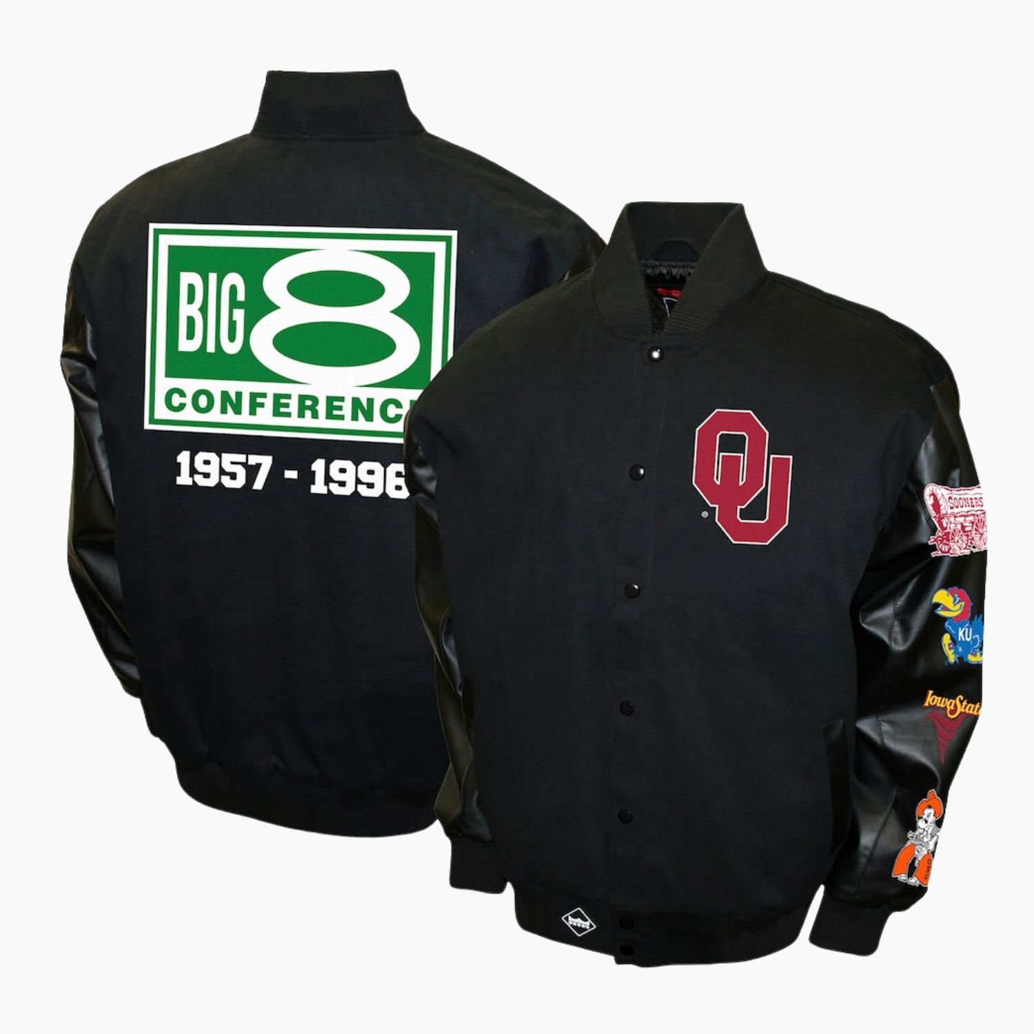 Celebrate a legendary era of college football with the Black Oklahoma Sooners Big 8 Conference Varsity Jacket. This premium piece of outerwear is a tribute to the historic dominance of the Sooners, blending retro sports heritage with a sleek, modern aesthetic. Constructed with a heavy-duty wool body and high-quality leather sleeves, this jacket offers the perfect balance of warmth and durability. The deep black colorway provides a sophisticated alternative to traditional team colors, making it a versatile staple for any wardrobe while still shouting your loyalty to Oklahoma.