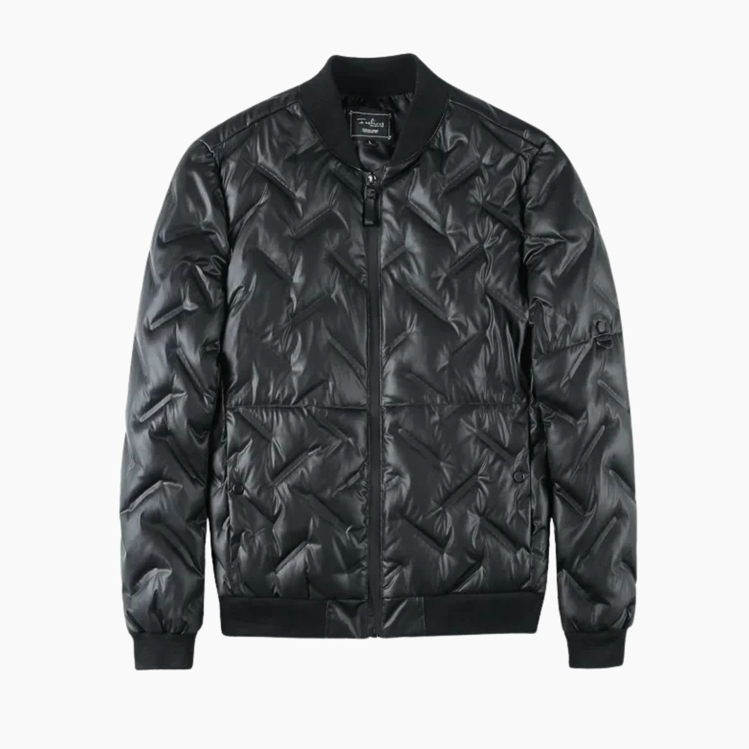 The design is anchored by a protective stand-up collar and a heavy-duty front zipper closure, providing a fortified seal against biting winds. With its quilted padded style, this jacket by Movie Jackets Hub delivers a sophisticated, textured appearance that transitions effortlessly from casual denim to professional attire.