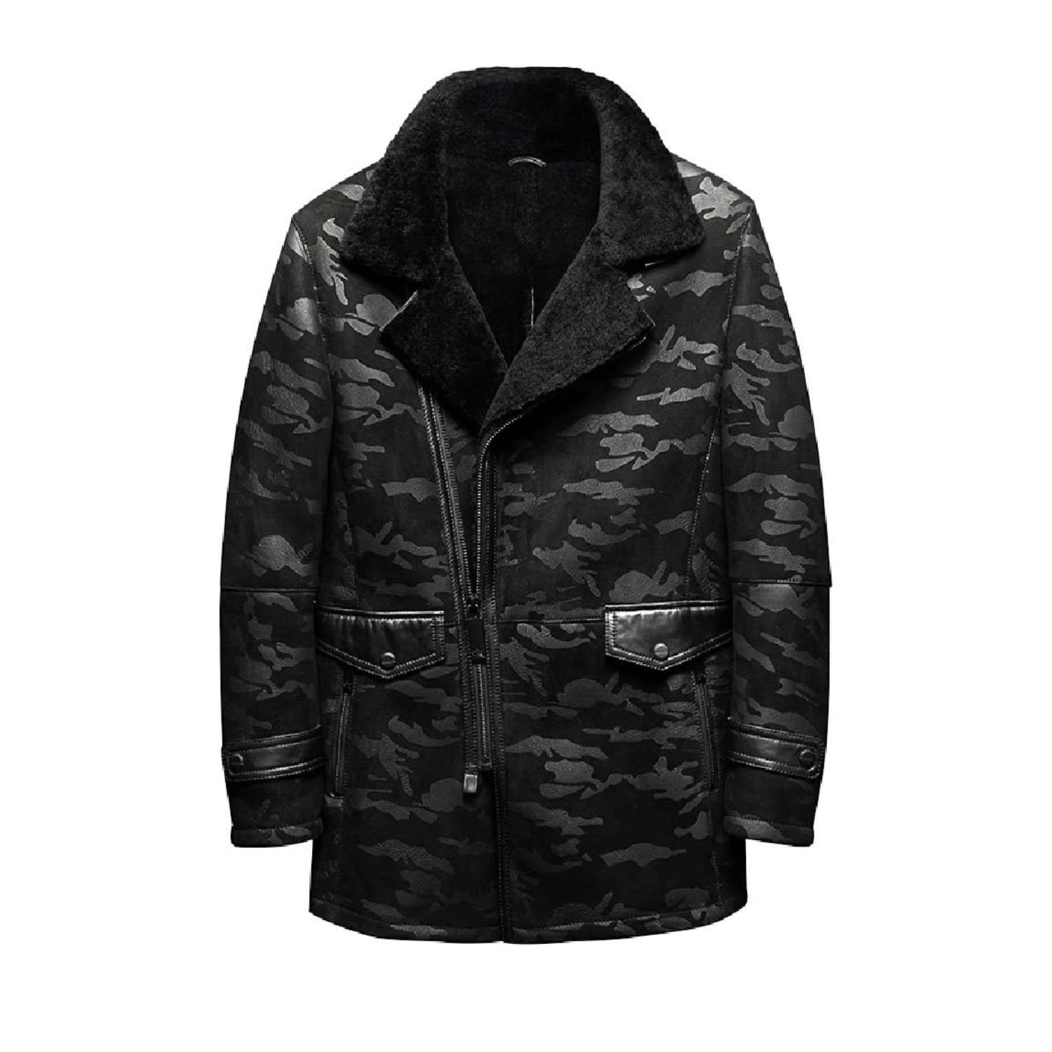 Charles Black Camo Lapel Shearling Leather Coat