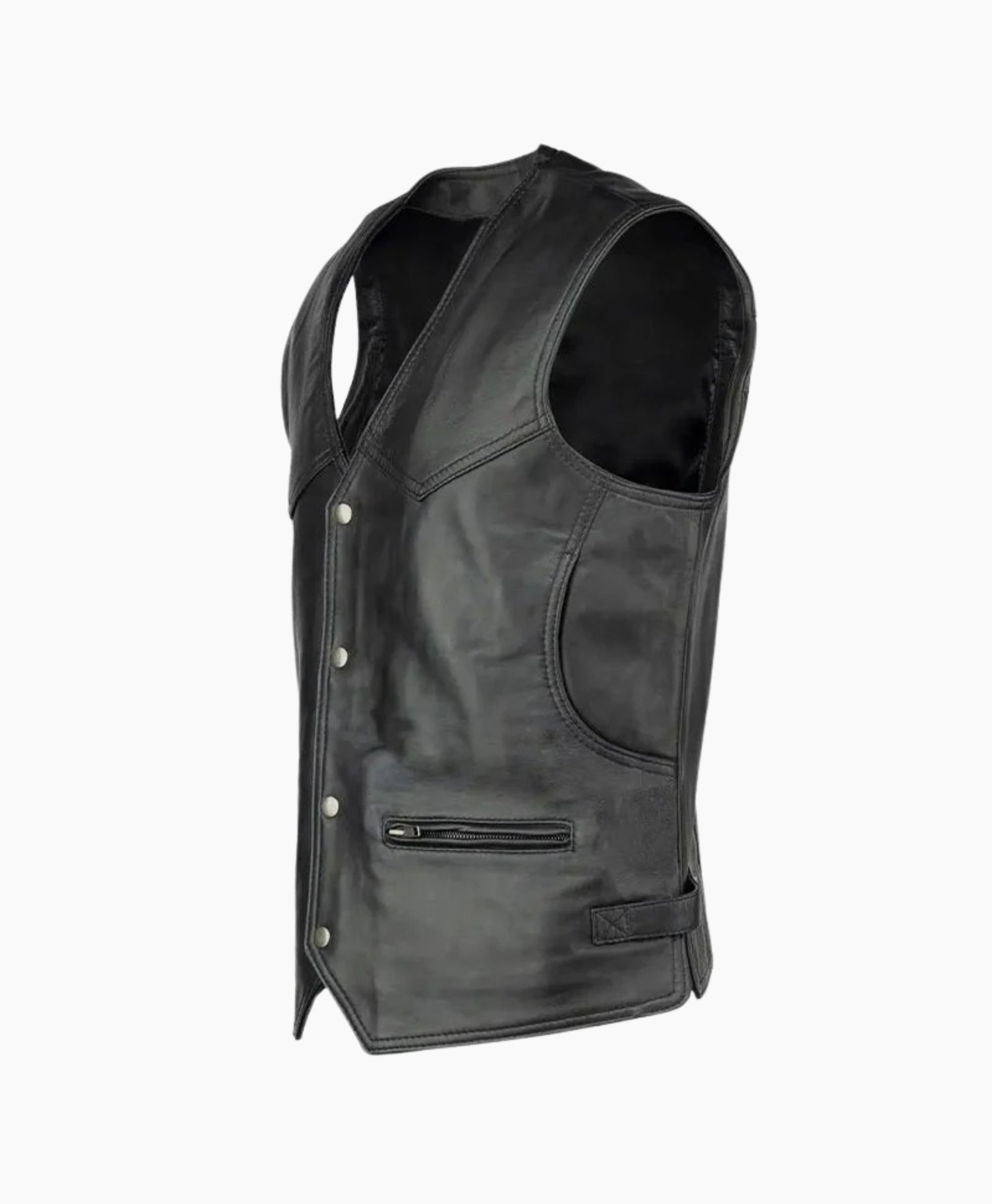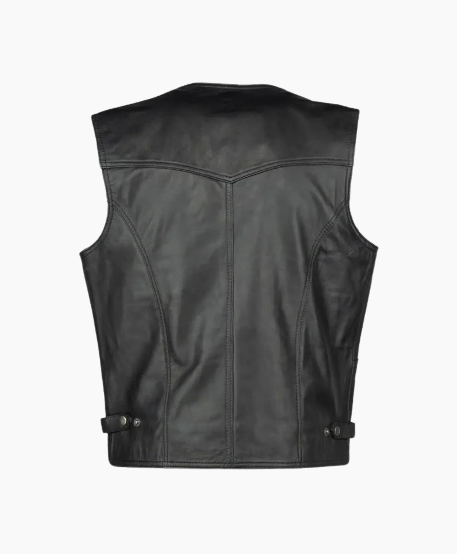 Perfect for layering over shirts, hoodies, or sweaters, this sleeveless leather vest by Movie Jackets Hub offers year-round versatility. The soft nylon lining ensures breathable comfort, while the solid black finish adds a bold and polished touch to your everyday look. Functional yet fashionable, it includes two front pockets and zip detailing that accentuate its refined, masculine appeal.