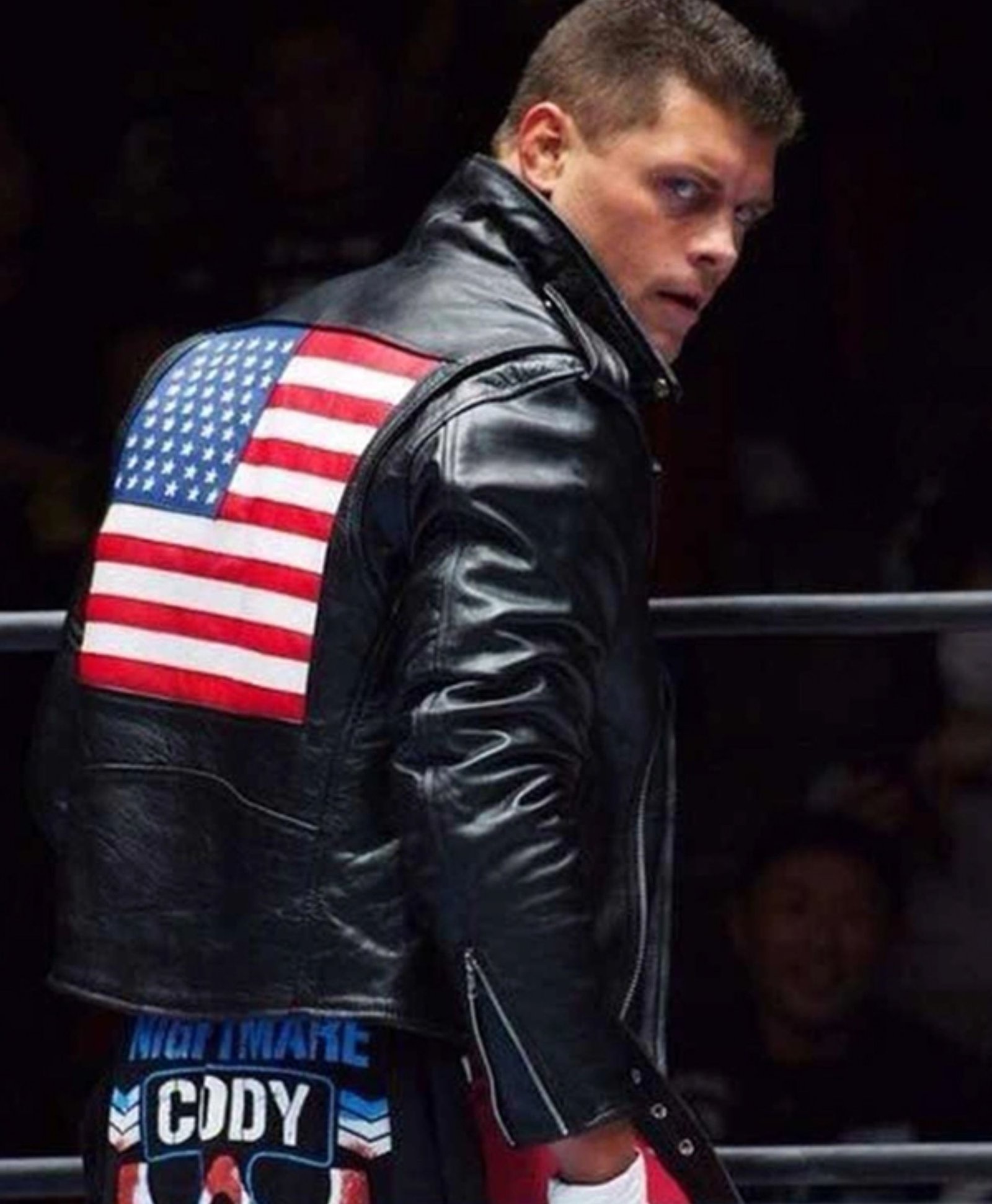 Show off your bold, patriotic style with the Cody Rhodes American Flag Biker Jacket, inspired by the iconic look of the wrestling superstar. Expertly crafted from high-quality real leather, this jacket is a perfect mix of rugged biker aesthetics and standout personality.