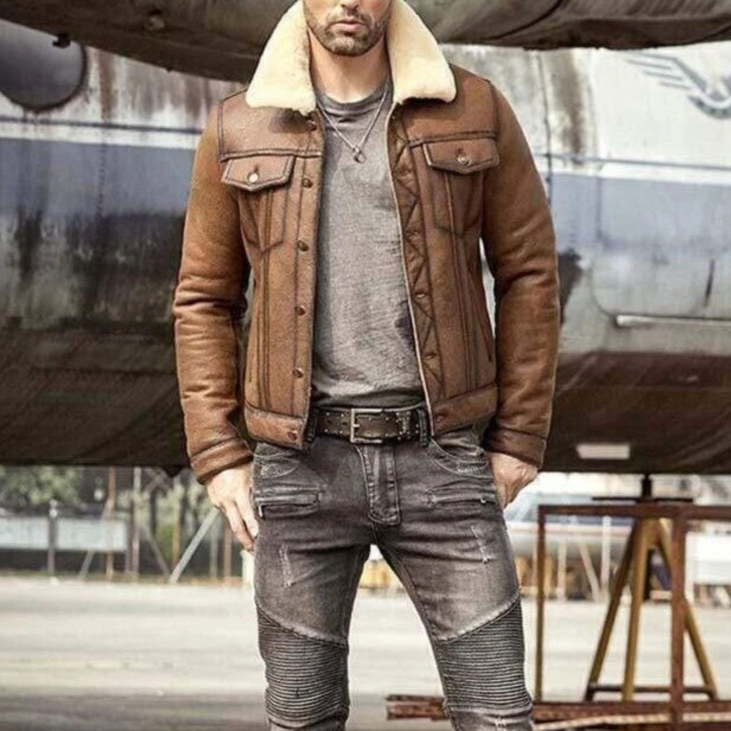 Mens Daniel Air Force Shearling Fur Brown Trucker Leather Jacket is genuine leather. The Shearling fur lined in its interior gives excellent warmth and comfort to the wearer. The cozy jacket is styled as a Shearling Fur trucker jacket. The Shearling fur collar style makes the jacket more appealing. The jacket has a stylish brown color which looks elegant.