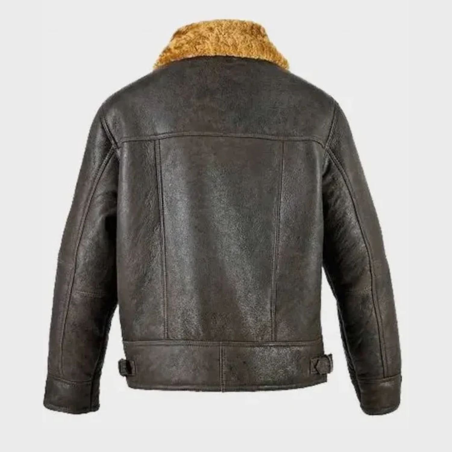 Brown shearling Men Leather Jacket accommodates a smoothy shearling fur collar with a single buckled strap around the throat. It has a front YKK zipper closure. Furthermore, here are both waist-side adjustable buckle straps for your hemline to look fit. The winter jacket has full-length sleeves and open hem cuffs to look slim and fit. The brown-colored bomber shearling jacket has two outside and two inside pockets where you carry your stuff.
