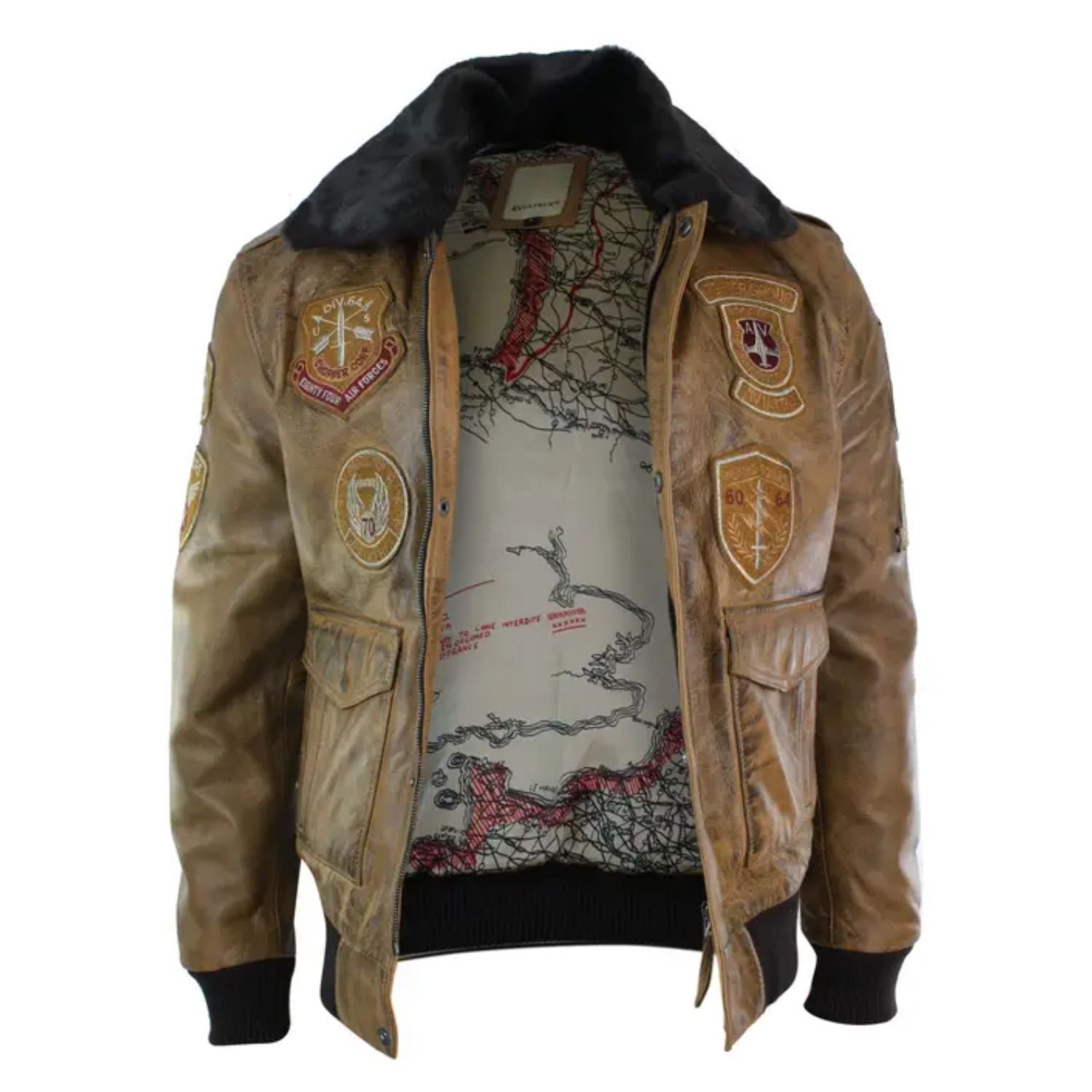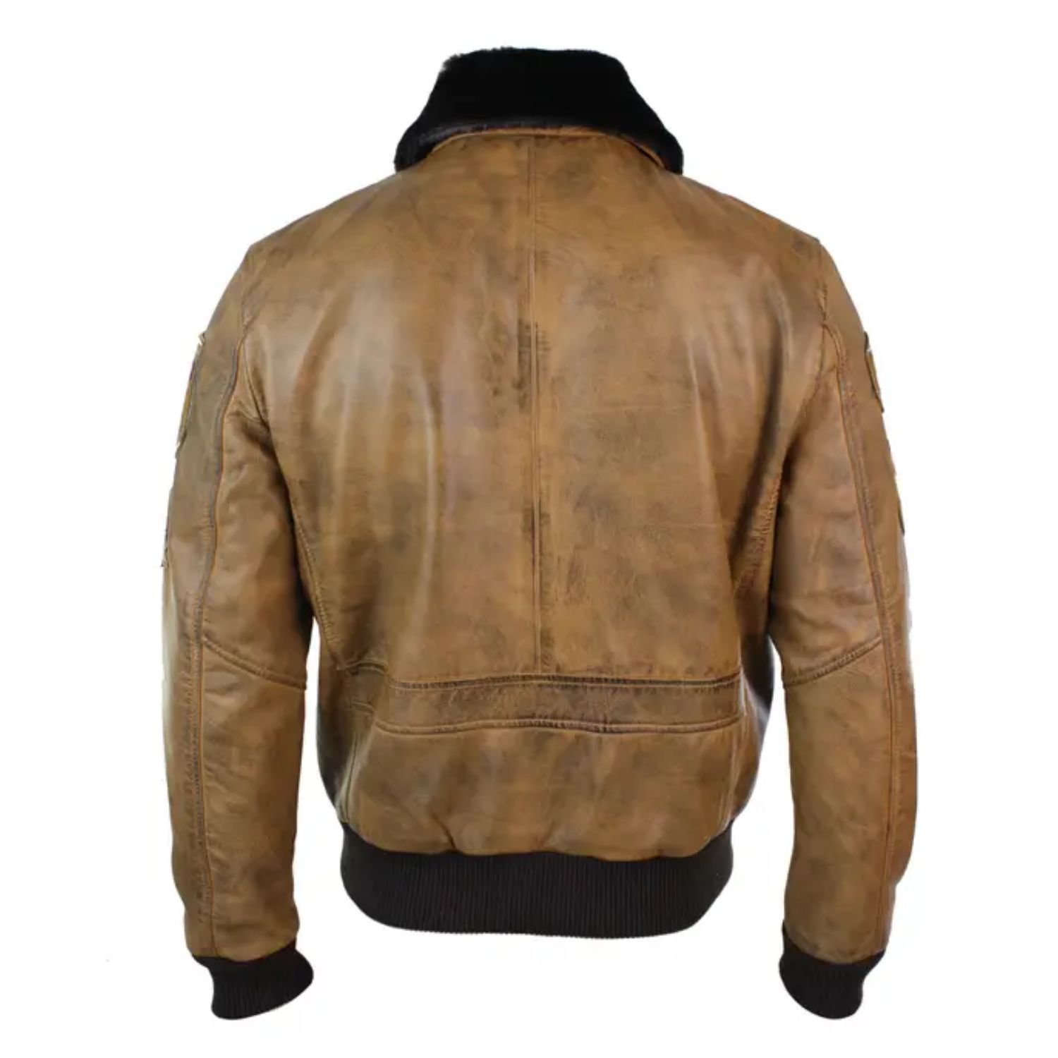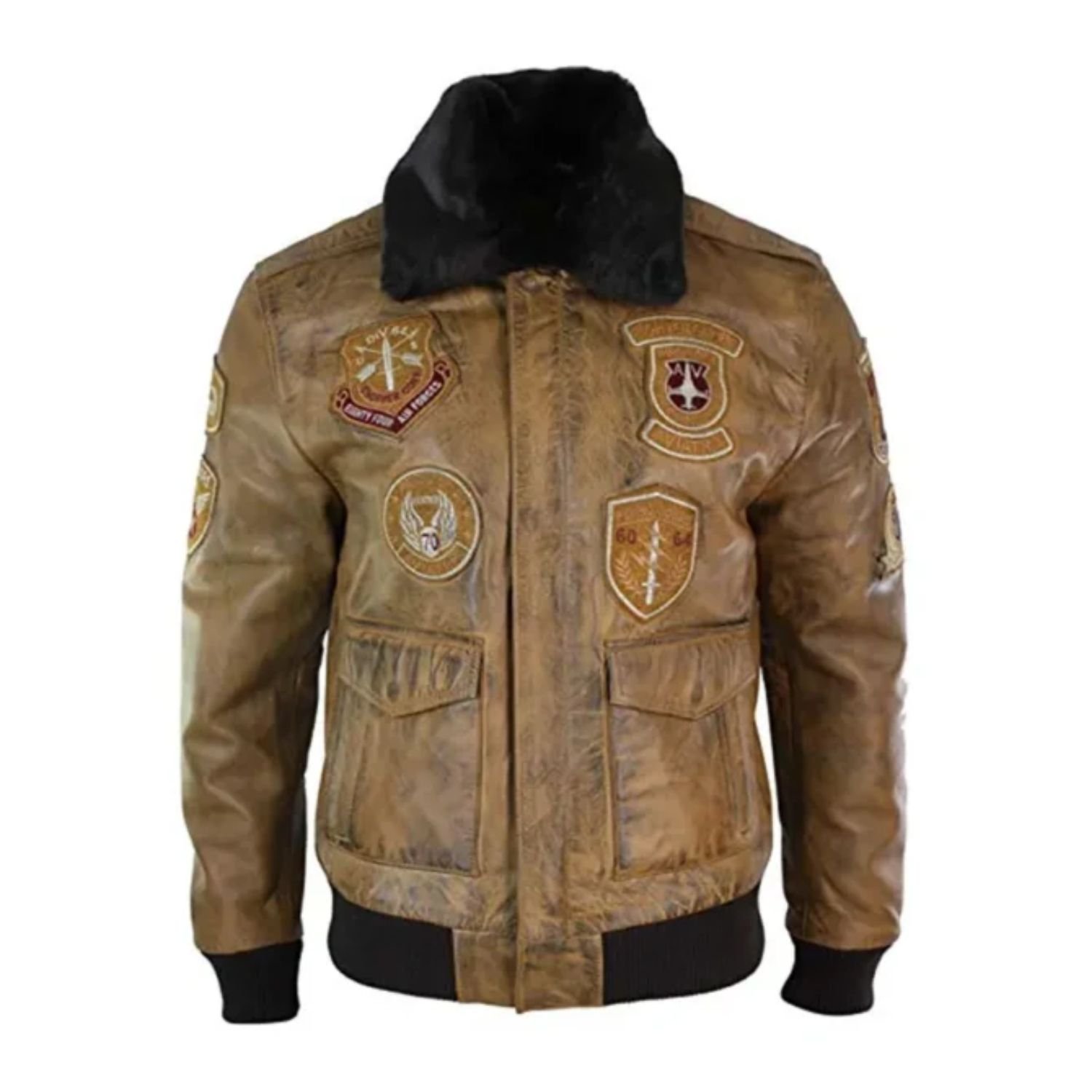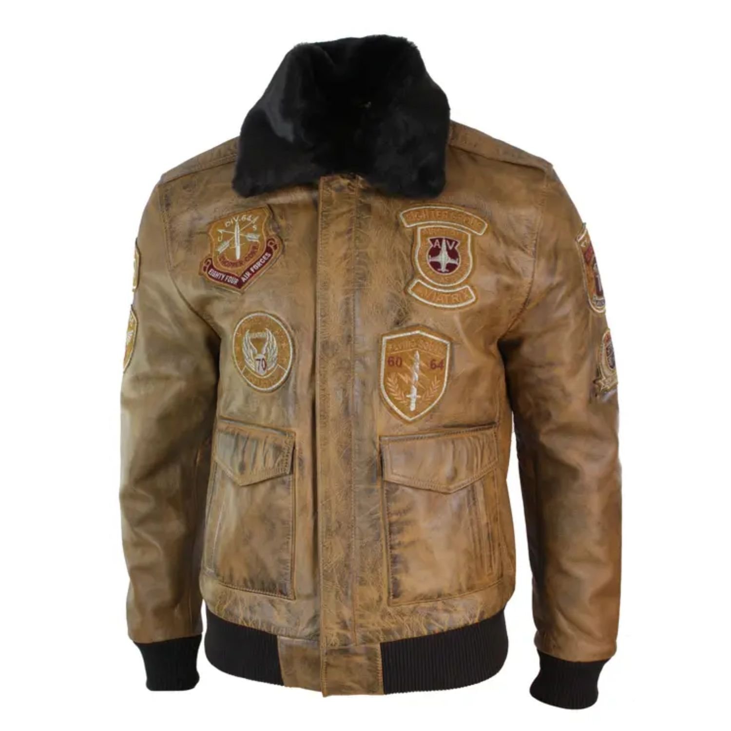 Devin Aviator Fur Collar Tan Bomber Brown Jacket with Patches