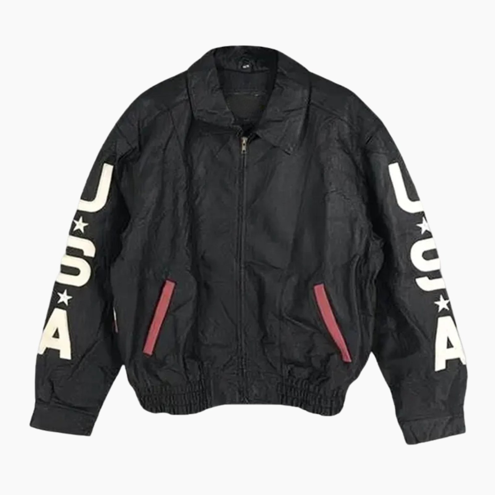 Featuring a shirt-style collar and front zipper closure, it offers a sleek silhouette perfect for casual outings, concerts, or streetwear fashion. The black color accented with the American flag design adds a patriotic touch, making it a standout piece in any wardrobe.