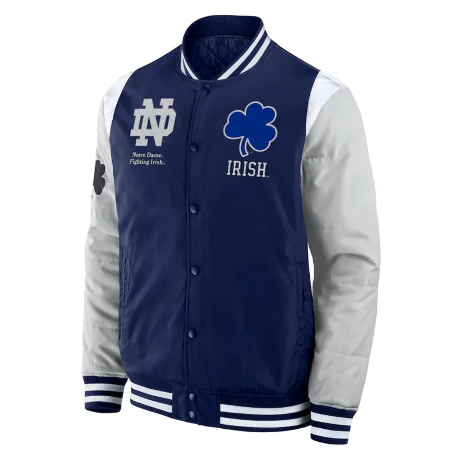 The rich navy blue finish features the Inspired by Notre Dame logo embroidered on the chest, highlighting your unwavering school spirit. Designed with rib-knit cuffs, collar, and hem for a comfortable, athletic fit, and a snap-button front for easy wear, this jacket by Movie Jackets Hub is ideal for game days, alumni events, or everyday style. Whether you’re cheering at Notre Dame Stadium or representing your alma mater around town, this jacket is built to showcase true Irish pride.