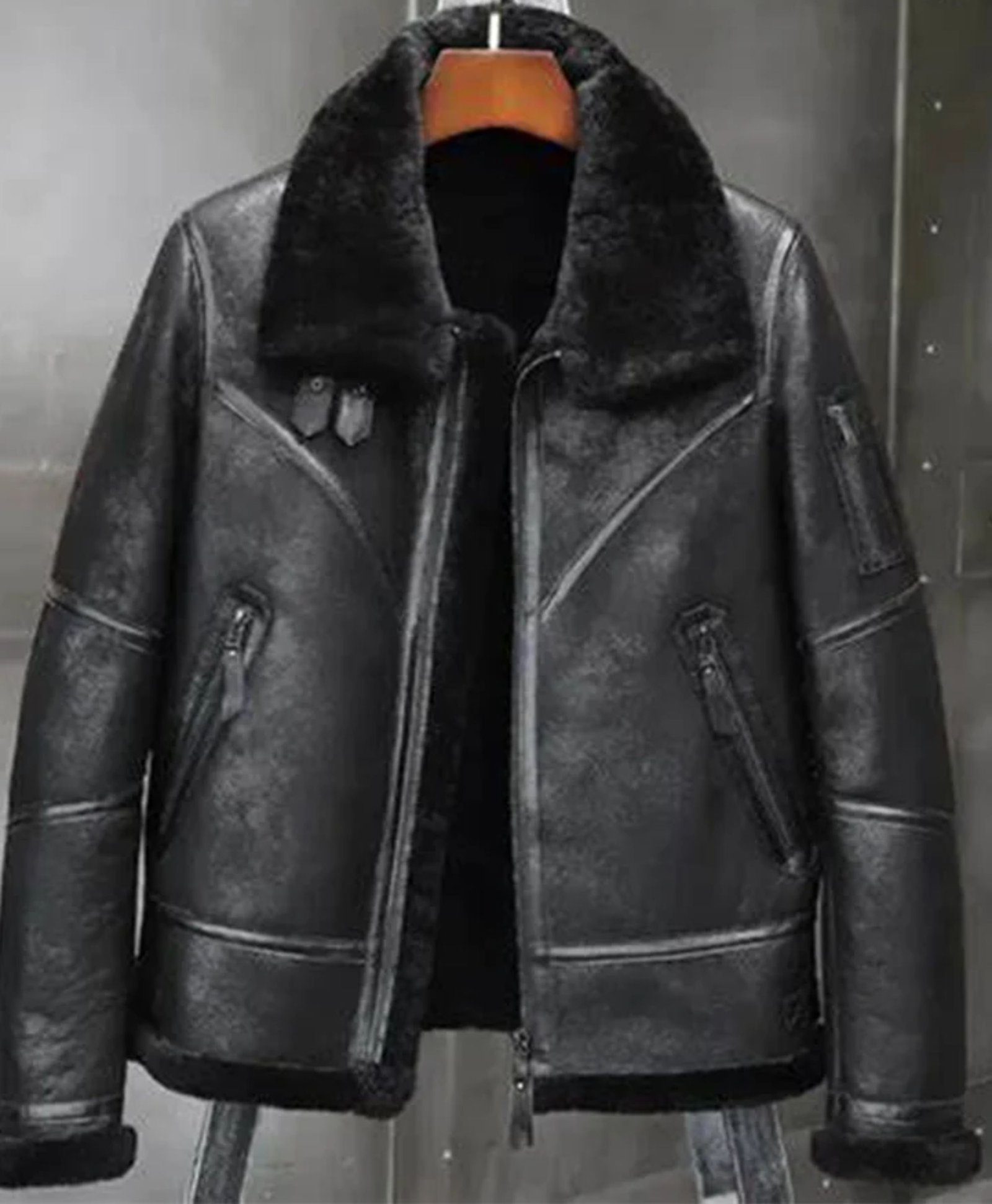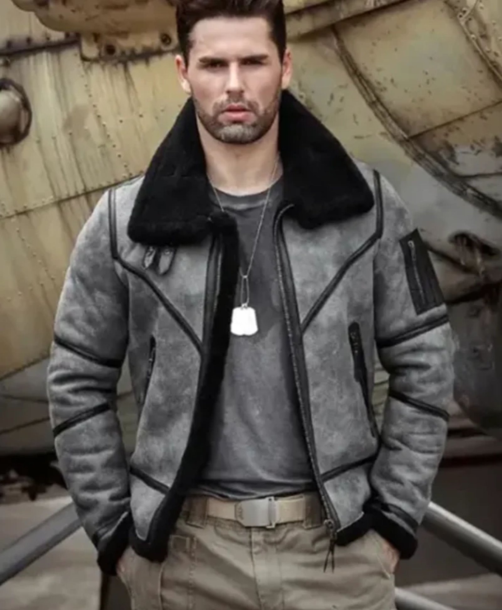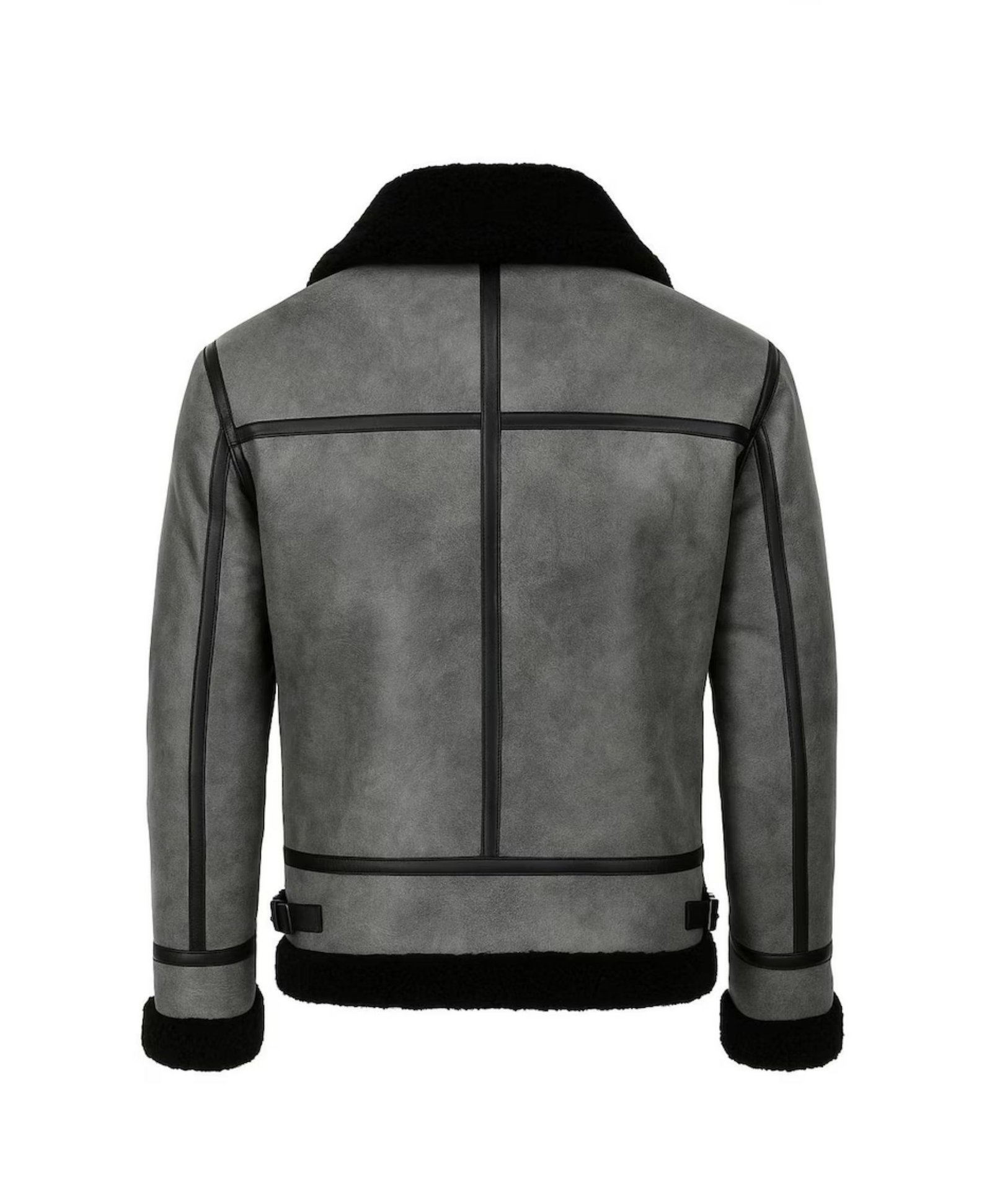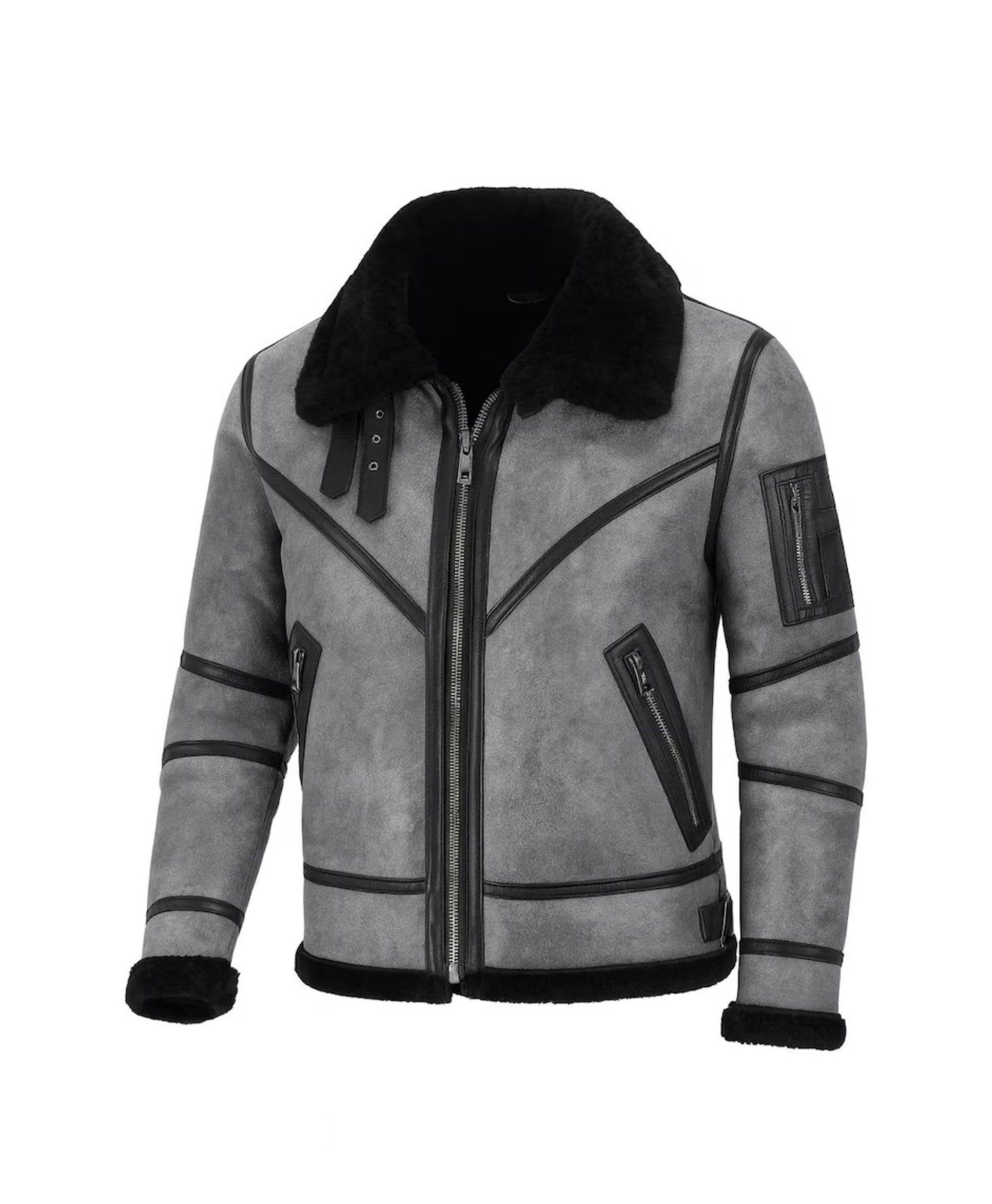 Eric SF Bomber Grey Black Triple Belted Cuffs Shearling Leather Jacket
