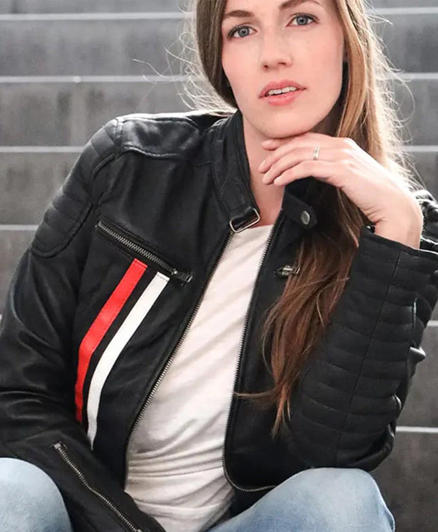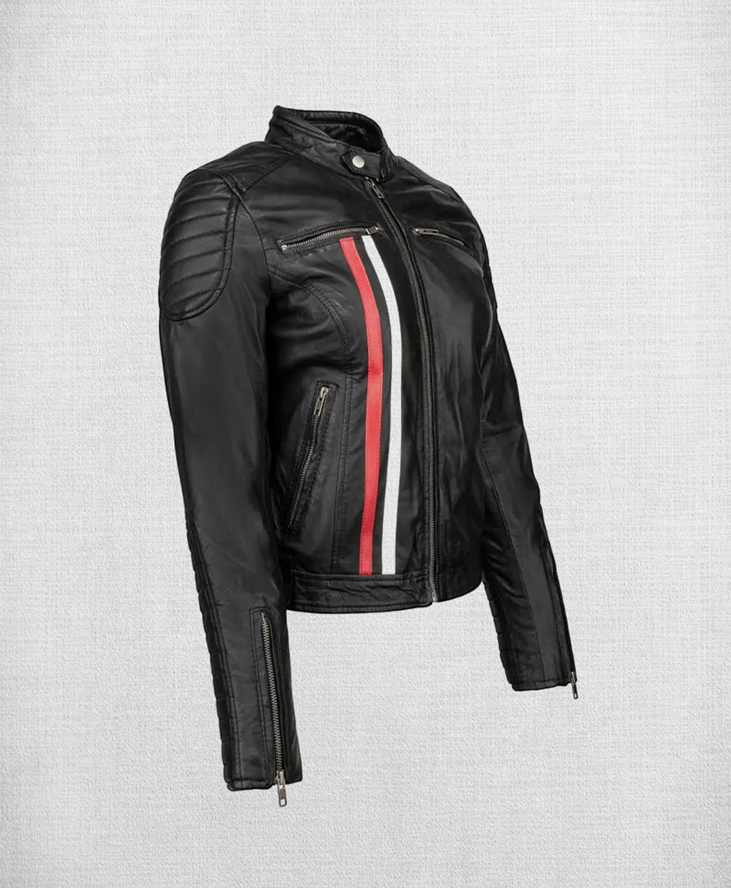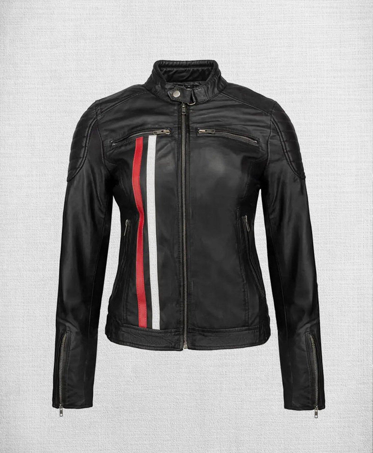 Expertly crafted from premium-quality genuine leather, this jacket by Movie Jackets Hub is as durable as it is stylish. The soft inner lining ensures maximum comfort, while the vibrant white and red stripes add a dynamic, eye-catching touch. Whether you’re on the road or strolling the city streets, this jacket guarantees a standout look.