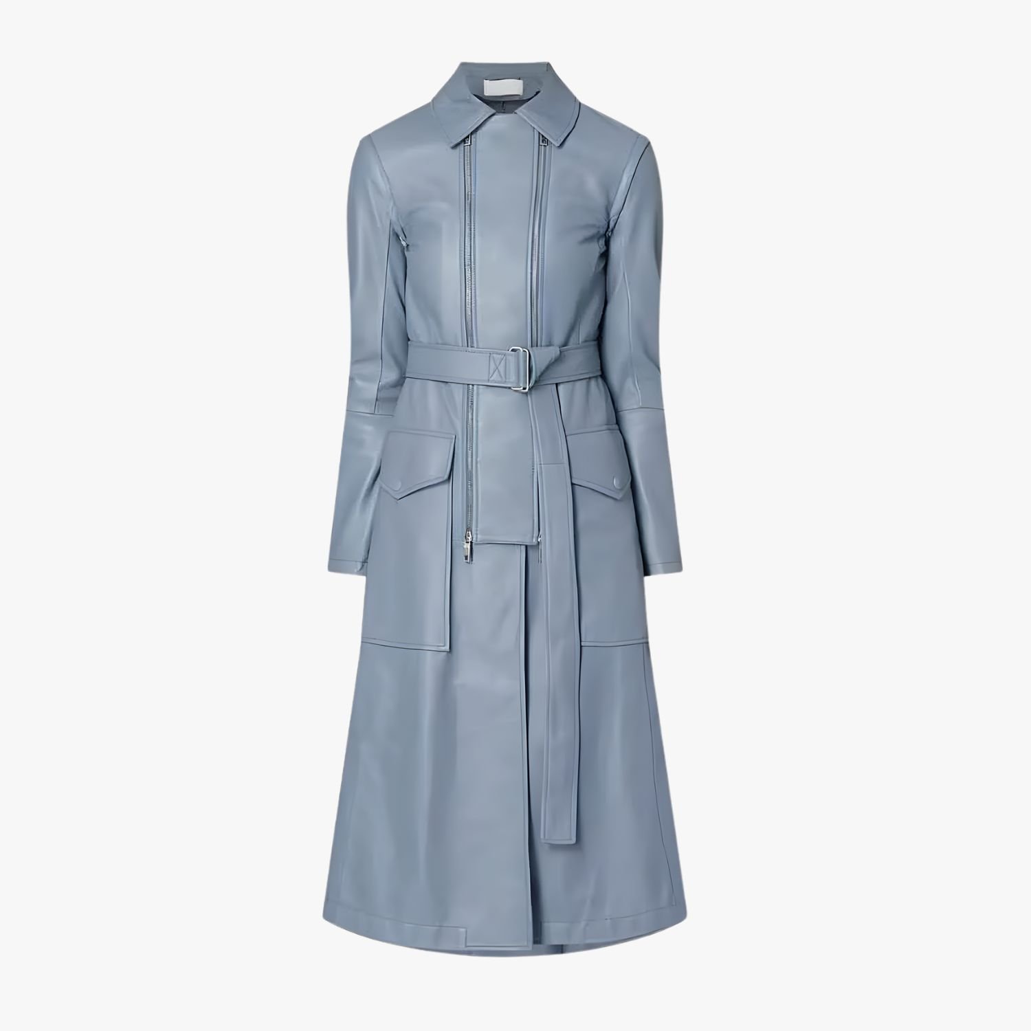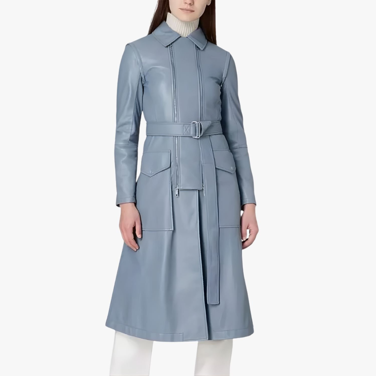 This beautiful coat by Movie Jackets Hub is crafted from genuine leather and features a soft viscose inner lining for exceptional comfort and warmth. It comes with full-length sleeves and stylish zipper cuffs for a refined touch. The design also includes a classic turn-down collar, a front zipper closure with an additional belt fastening, and two side waist pockets for practicality.