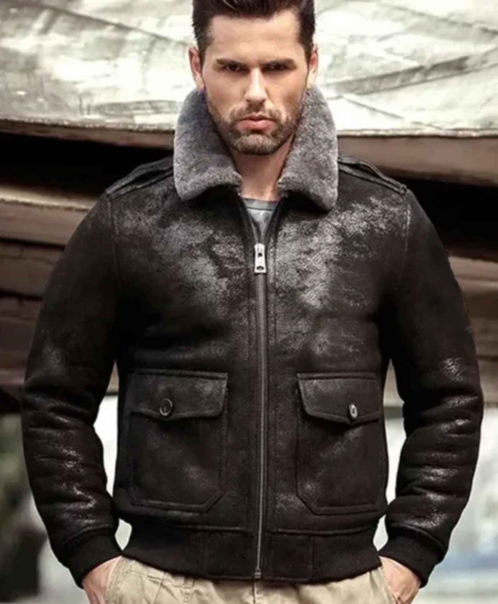 Gabriel Distressed Black G-1 Bomber Leather Jacket by Movie Jackets Hub is fabricated from suede leather/sheepskin leather. Its interior is lined with Shearling fur, giving you the desired warmth. Rib-knitted cuffs follow the jacket’s full-length sleeves. It also has a rib-knitted hemline for a perfect fit. The distressed color makes this jacket looks rough and tough.