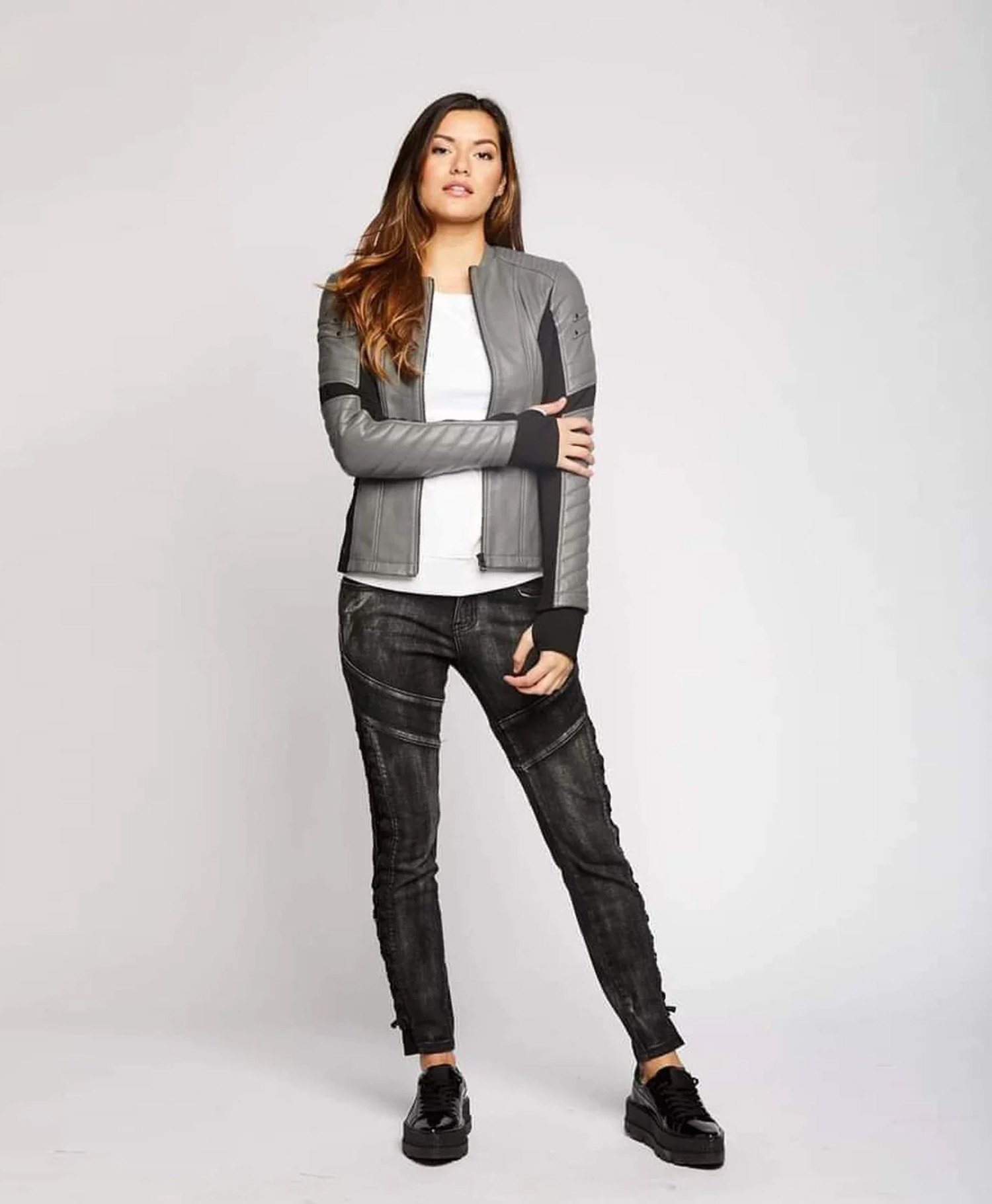 Grey and Black Leather Jacket for Women