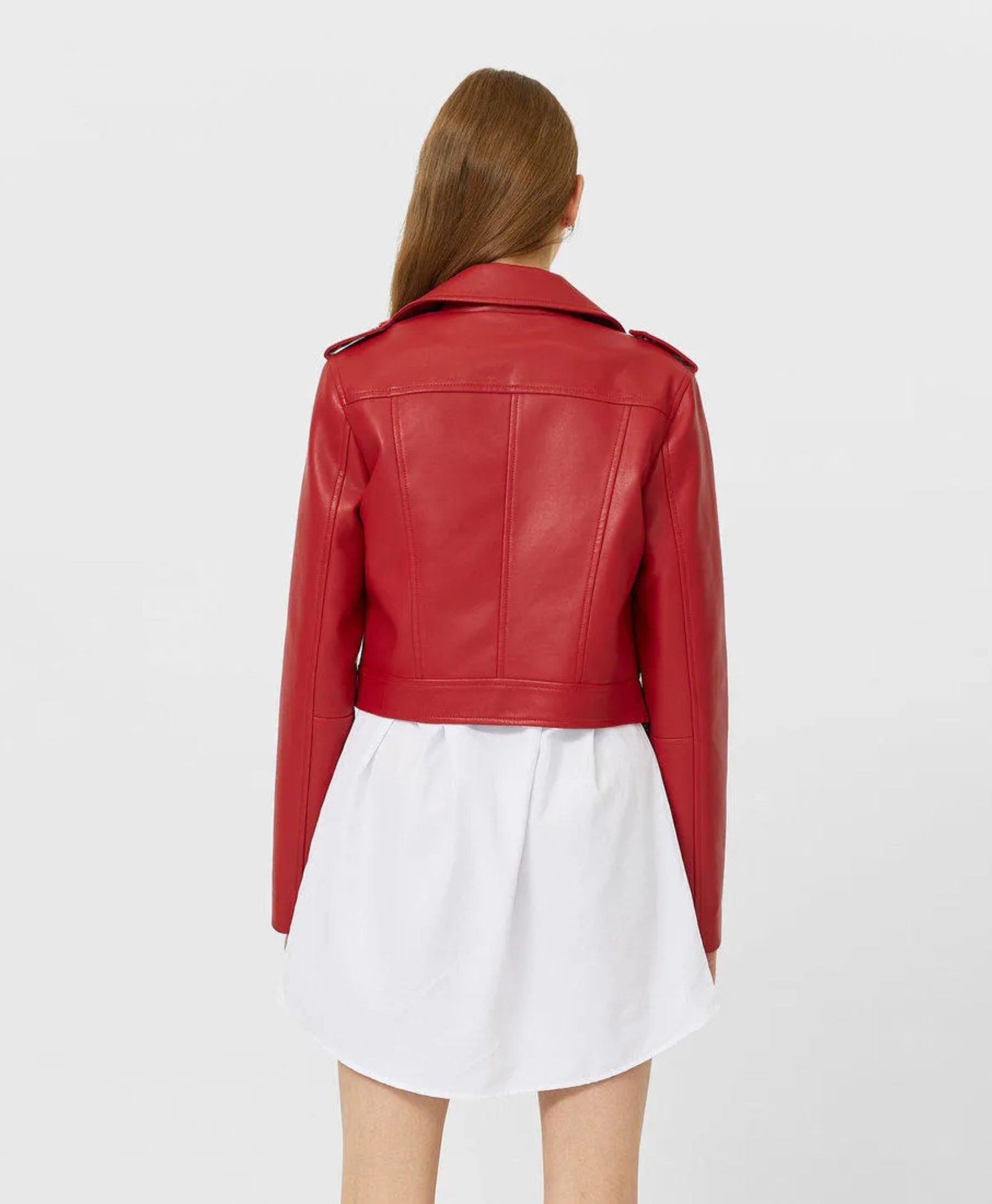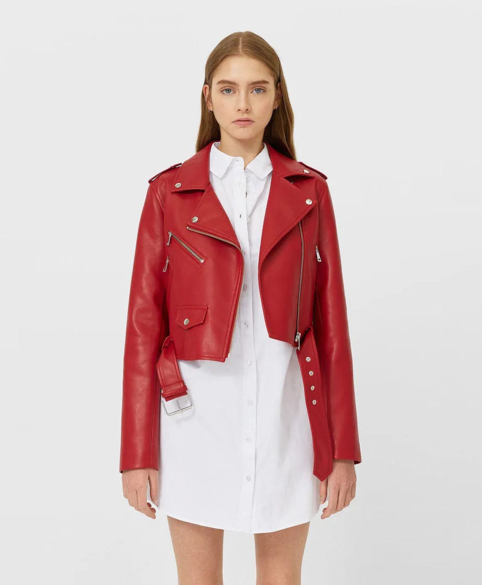 Designed with a biker jacket silhouette, the piece features an asymmetrical zipper closure paired with a notch style collar for a sleek and edgy finish. The belted waistline enhances the fit, allowing for a flattering and adjustable shape. Full length sleeves with YKK zipper cuffs add both functionality and style, while the vibrant red color brings a confident and eye catching presence to any outfit. With two side pockets and two inner pockets, you get practical storage without compromising the clean and structured look.