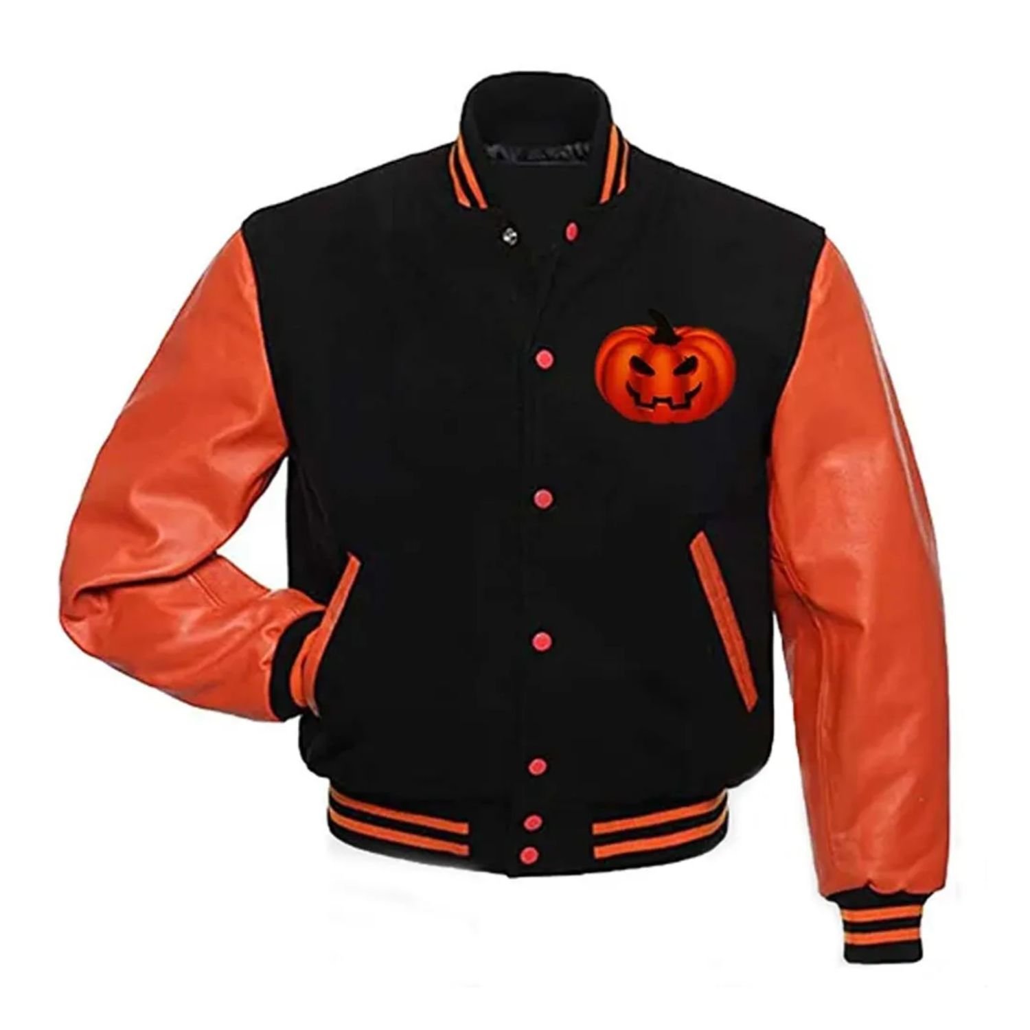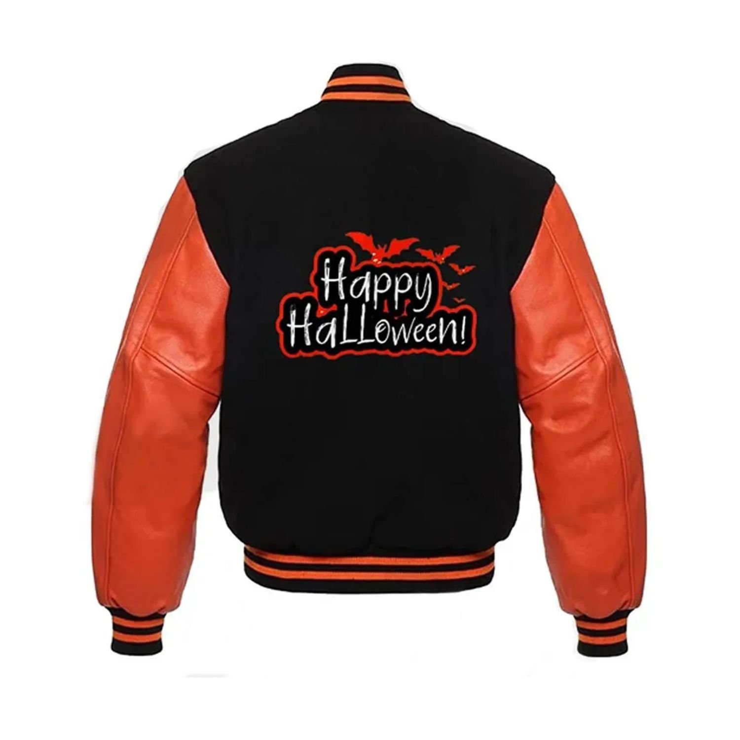 There is no doubt that Halloween is one of the most anticipated holidays of the year, as people get to wear the best costumes. And we think you should also do the same and dress well for it by wearing this stylish Bomber Jacket. If you wore this bomber jacket on the day of Halloween this year, then you will create happy memories that you will remember and cherish your whole life. This Halloween-inspired bomber jacket has a beautiful black color with sleeves in orange color that makes it look stunning. This Halloween bomber jacket is available in two options such as wool fabrics and Fleece fabrics for you to choose from. The best thing about this jacket is that it can be worn by both men and women. We have made this Mens and Womens Happy Halloween Printed Varsity Bomber Jacket For Sale. This jacket has a viscose lining fitted inside to make it warm to wear. It has a front button closure and a rib-knitted hemline. It has a rib-knitted style collar and long sleeves made from Faux Leather, and they end on rib-knitted cuffs. This jacket has two side pockets and two inner pockets.