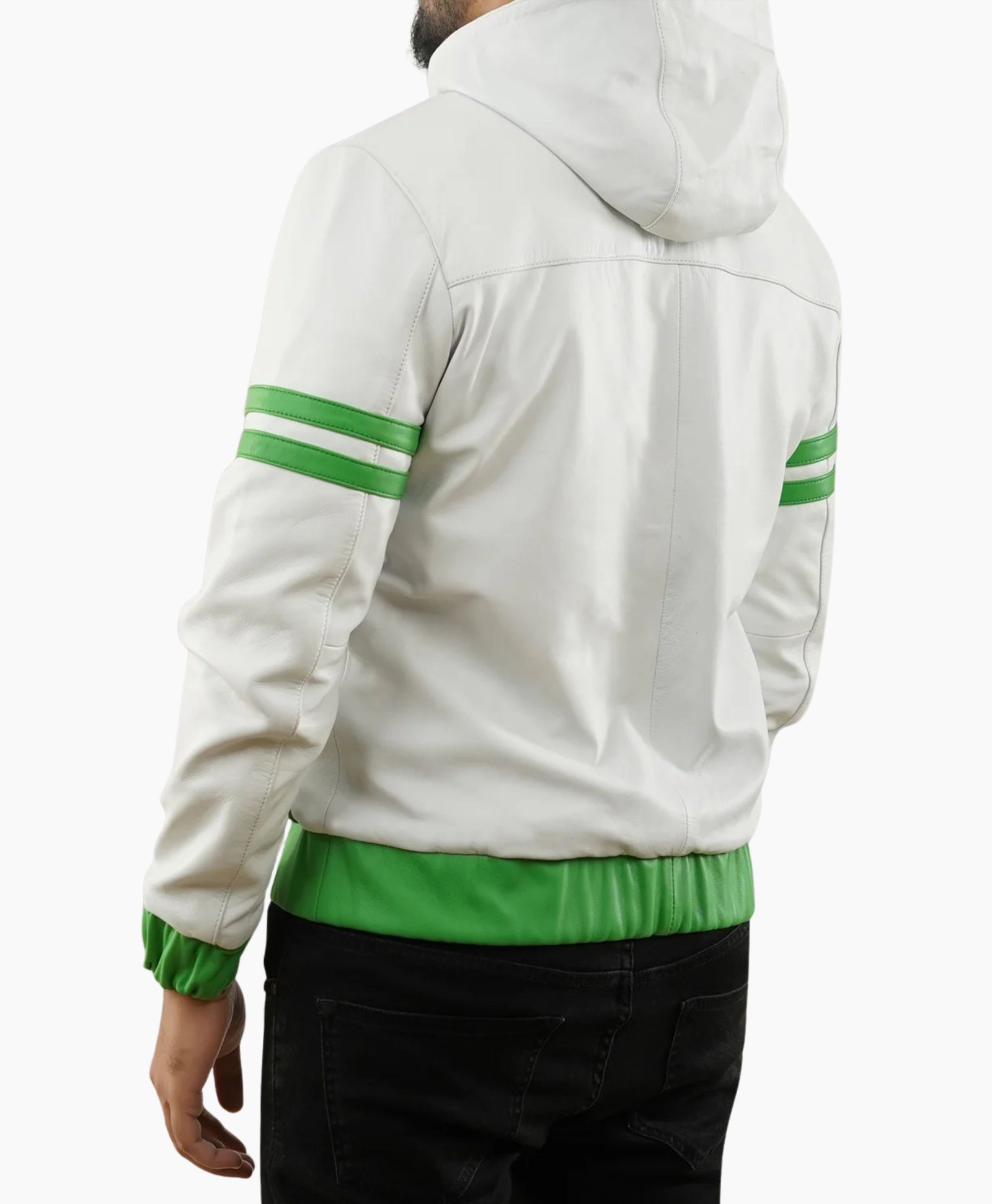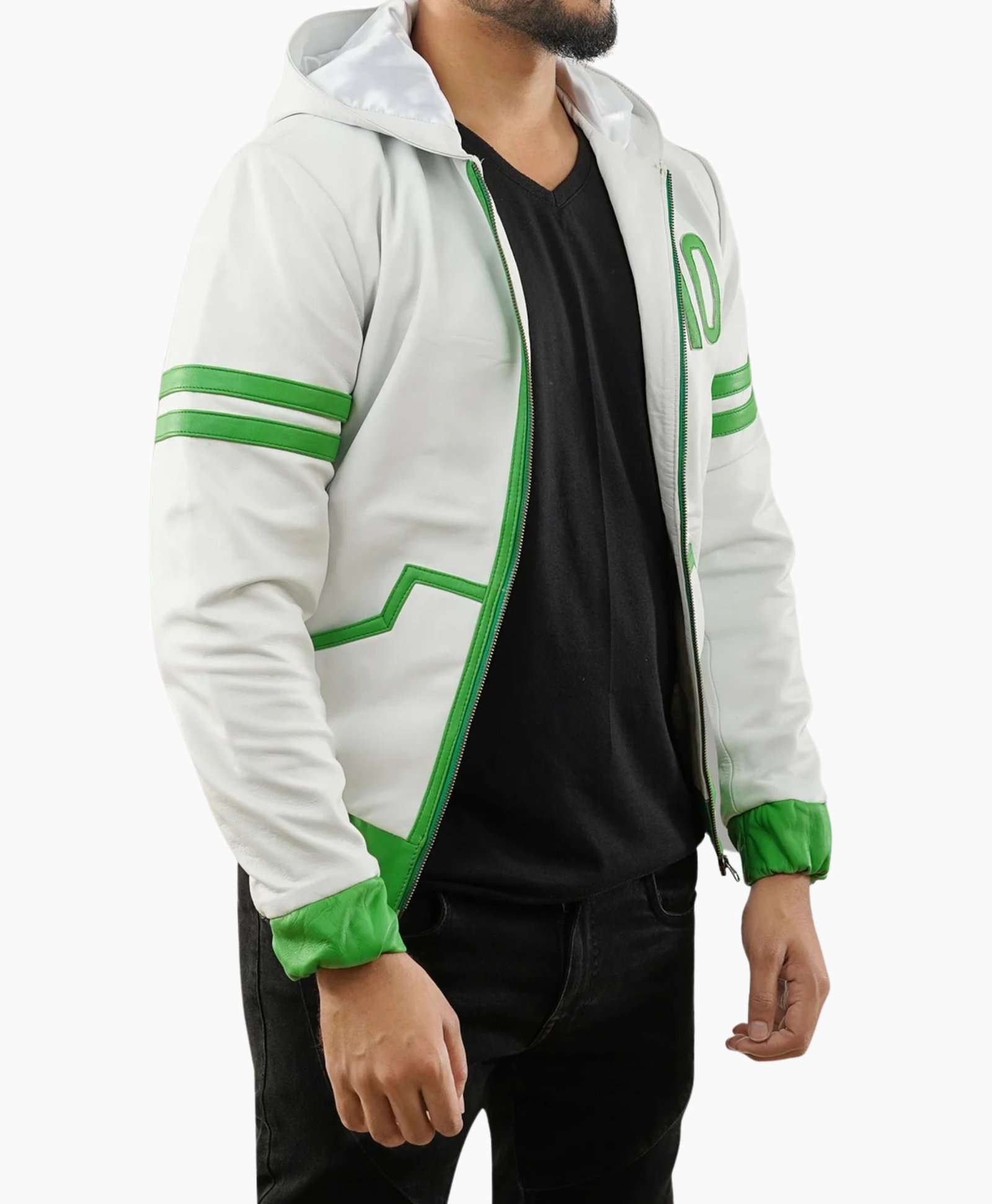 Bring your favorite animated hero to life with the Inspired Ben 10 Omniverse Green and White Hooded Leather Jacket, a perfect blend of bold style and comfort. Made from high-quality real leather, this jacket captures the adventurous spirit of Ben Tennyson from the hit series Ben 10 Omniverse. Designed for true fans, it delivers a powerful combination of durability, trend, and nostalgia.
