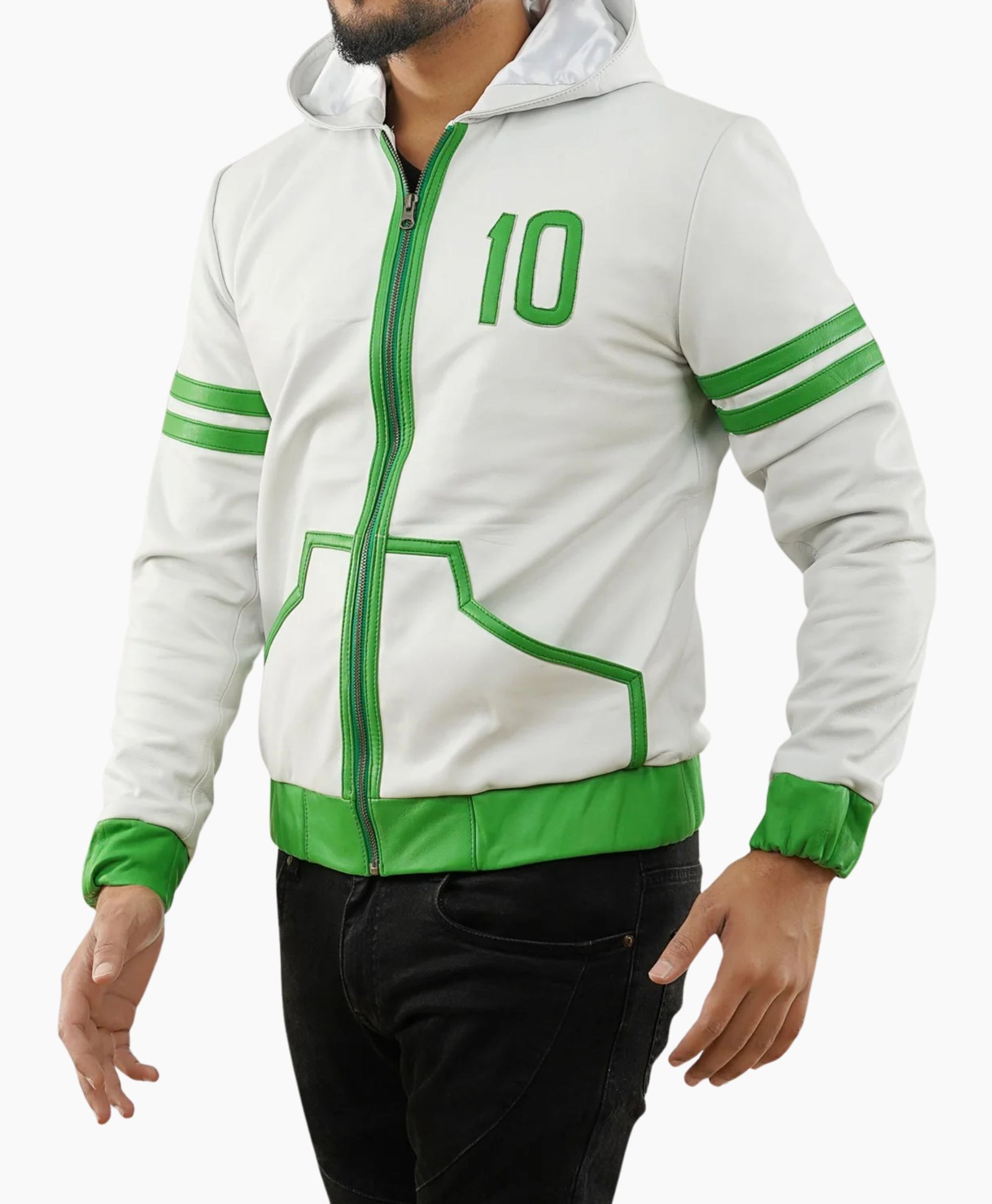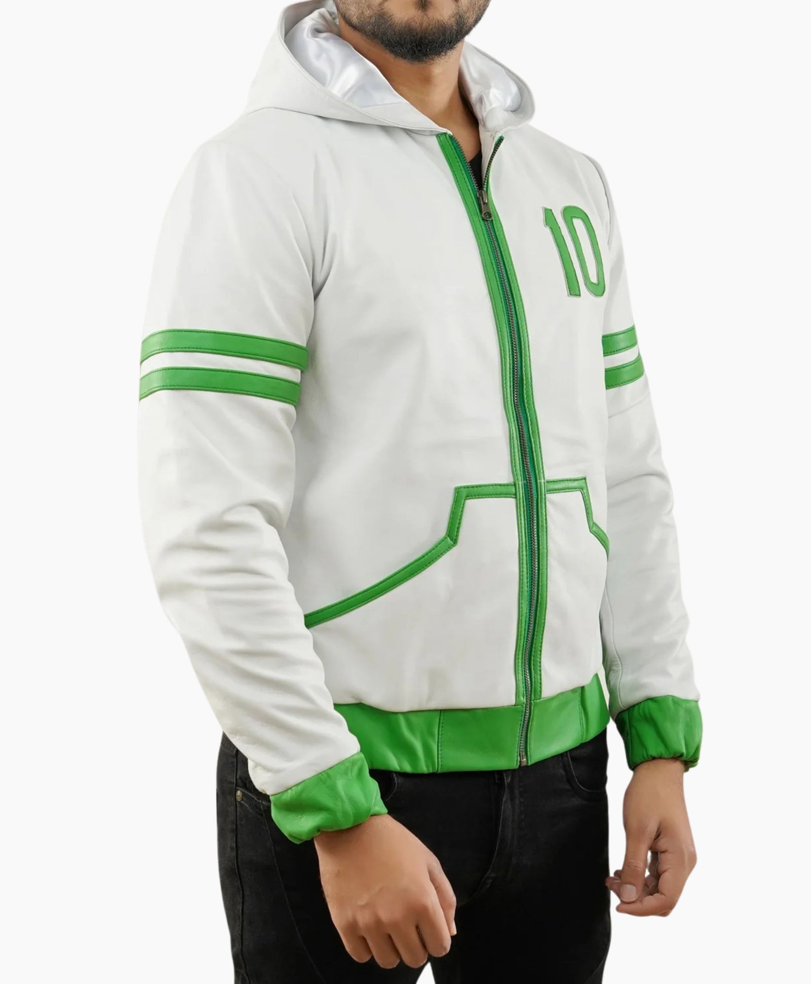 The jacket features a front zipper closure and a stylish attached hood, giving it a sporty, youthful look. Its green and white color combination reflects Ben’s signature design, making it instantly recognizable and visually striking. The comfortable viscose lining ensures a cozy fit, while the elastic leather cuffs provide a snug finish that complements its modern silhouette.