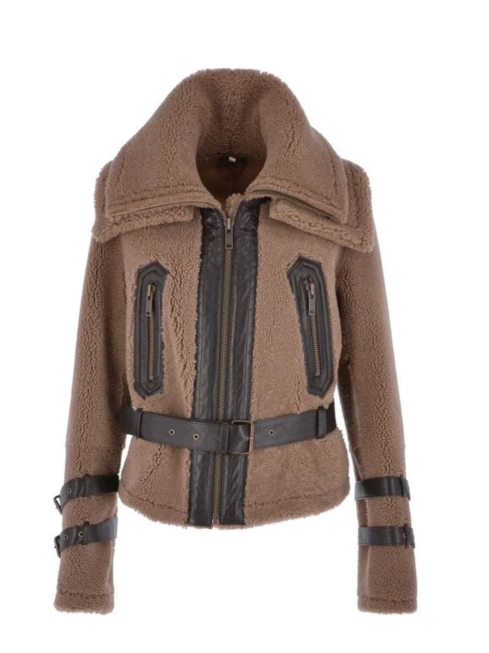 Women’s brown shirt style fur jacket has some more essentials, such as a double shearling collar, which makes it out of class. The women’s double-collar brown shearling jacket has full-length sleeves and open hem cuffs, plus a double-belted design. Moreover, It has two YKK zipper pockets outside and two inside pockets where you can keep your essentials. It is available at an affordable price with a discount, and all sizes are available of this jacket. Buy shearling jackets for women It comes in a lovely tan-brown color.