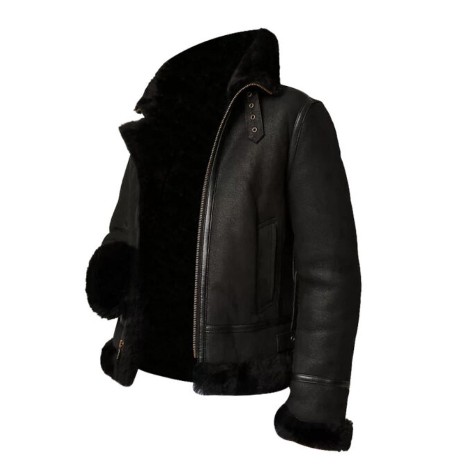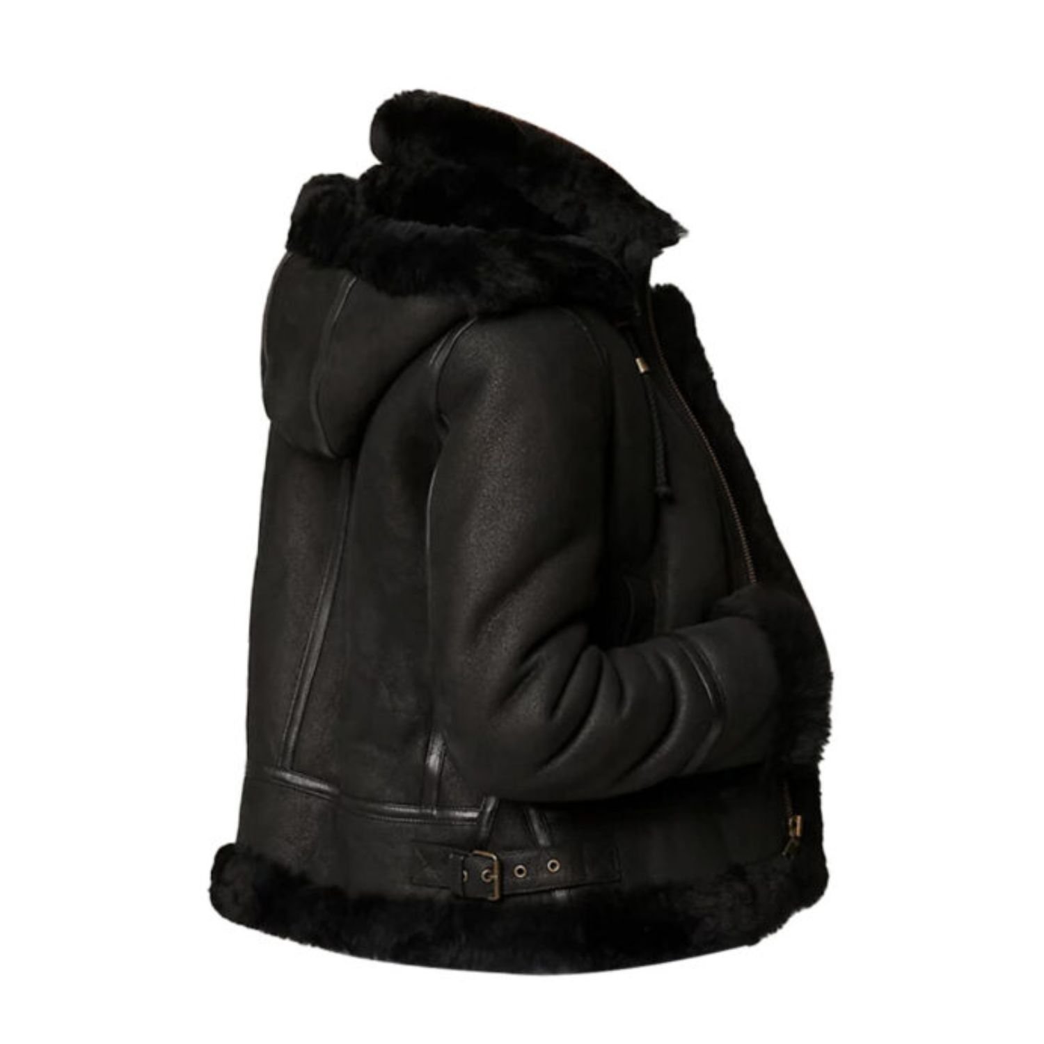 Joel Aviator SF Bomber Sheepskin Shearling Fur Black Leather Jacket with Detachable Hood is made from real sheep leather. Its interior is lined with shearling fur. It has an attractive YKK Zipper closure. Its collar has shearling fur with a belt. The open hem cuffs are also lined with fur. Overall, it is a classy jacket with all the features that will motivate you to keep it in your wardrobe.