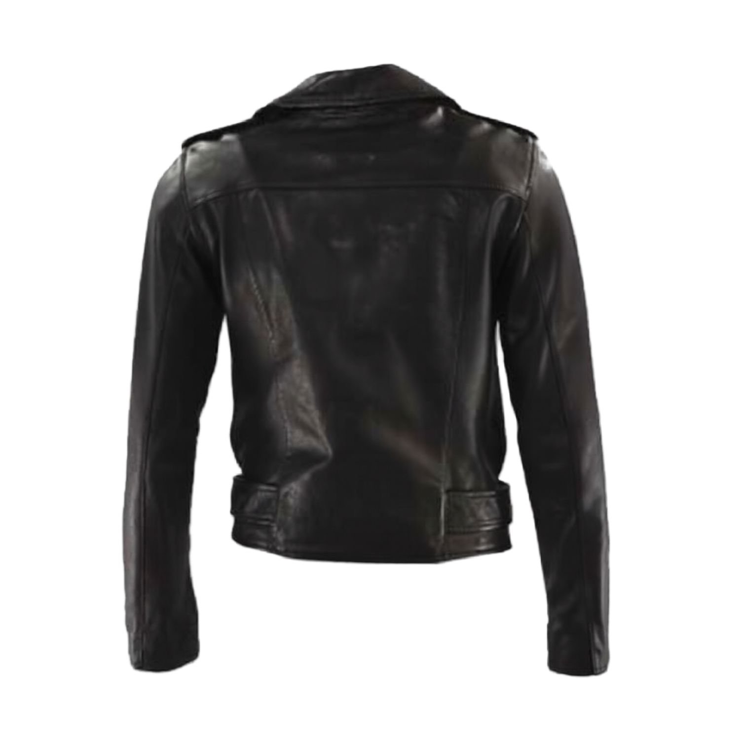 It is made of the material which is the faux leather which enhances its beauty. It has internal viscose lining which gives it an overall delicate look. It is available in black color which is very charismatic. At the front, it has an asymmetrical zipper closure. It has sleeves in long length and in full fitting. This jacket has epaulets on its shoulder. The collar style is lapel with buttons on the corner. It has a buckle belt at hemline. It has zipper cuffs on both sleeves. This jacket has two side waist zipper pockets and one vertical zipper pocket which is present at the front of the jacket. It is available at a very low price. The stitching technique is also very superb.