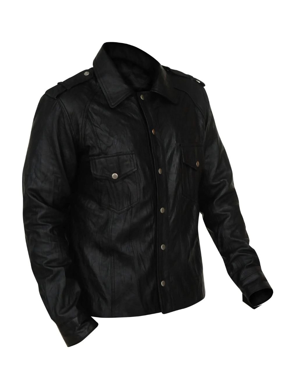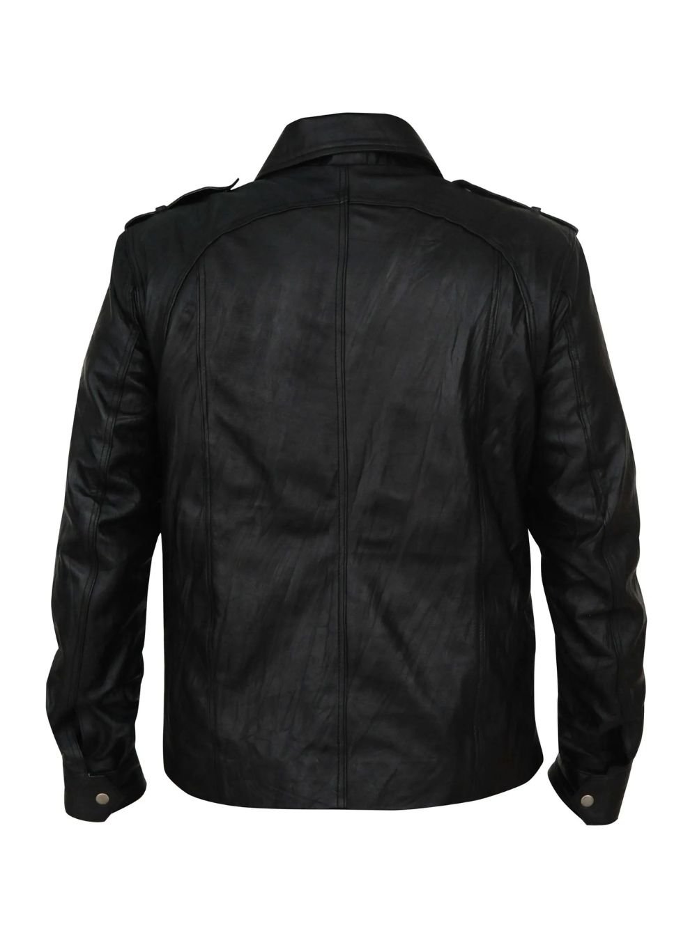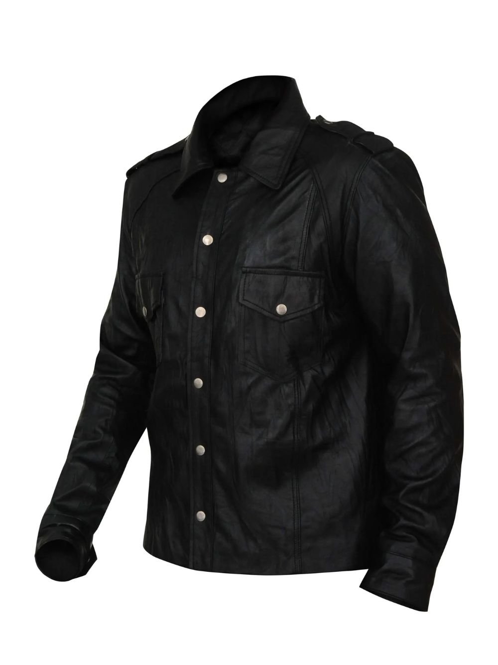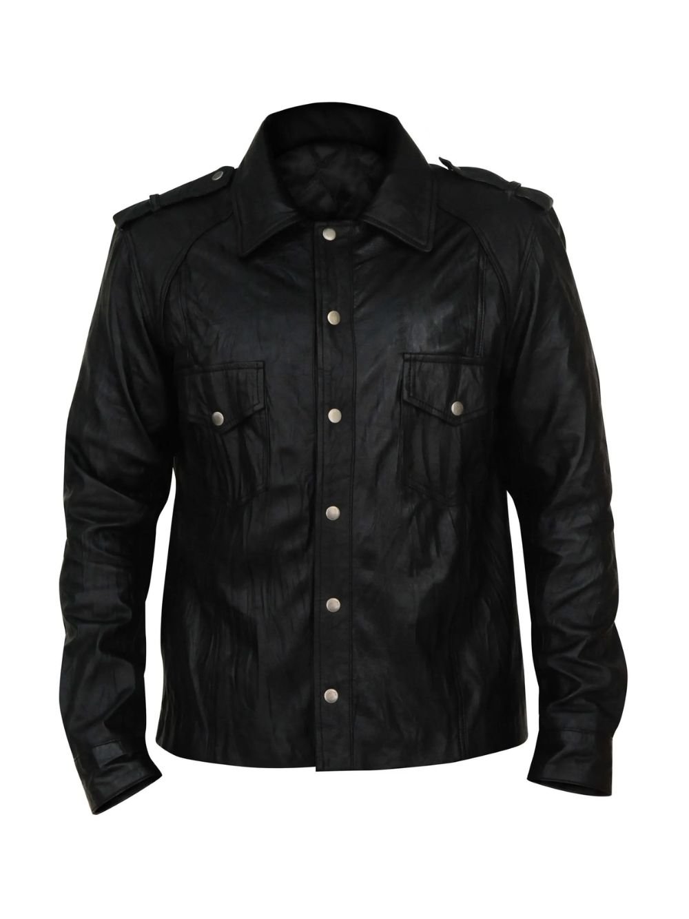 The silhouette of this jacket from Movie Jacket Hub is defined by its structured, masculine cut. It features a standard shirt-style collar that adds a touch of formal refinement to the rugged leather exterior. The front is secured with a traditional buttoned closure, departing from the standard zipper to offer a more vintage, timeless appearance. For added utility, the jacket is designed with spacious front flap pockets and discreet internal pockets, providing ample room for your phone, wallet, or other daily essentials.
