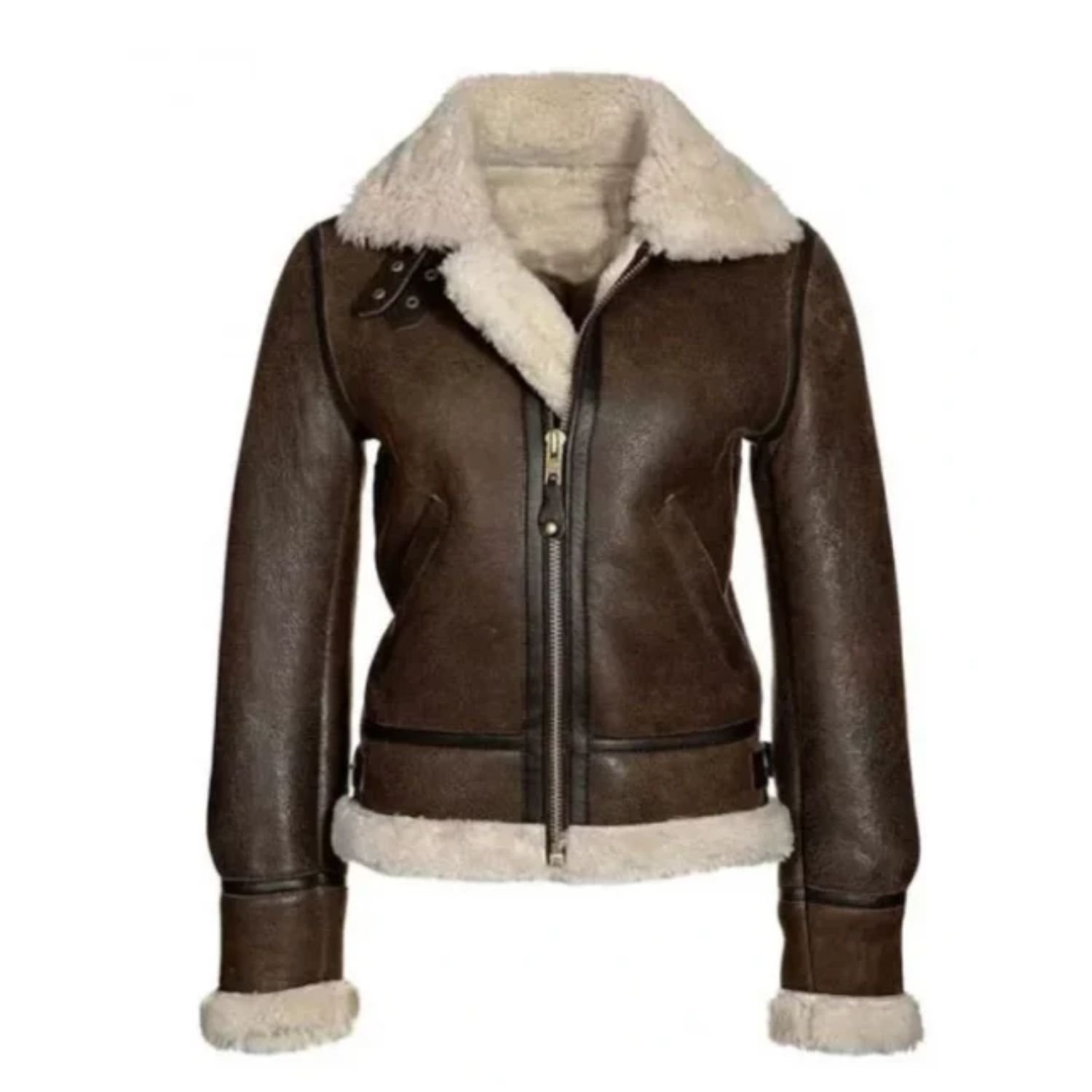 Katie Distressed Brown Shearling Leather Jacket by Movie Jackets Hub fabricates with the glossy and classy sheepskin natural leather of top quality. The sheepskin leather jacket’s craftsmanship is unique and superb. Furthermore, the relaxable and the most valuable quality shearling fur fabric has stitched inside to gives you an excellent level of comfort and warmness. The women’s sheepskin leather jacket has a shearling fur collar to protect your nape from harsh cold winds. It has a front YKk branded original metal zipper closure, which protects you from cold weather and gives you an outstanding and beautiful appearance. You can carry it with any costume. It is comfortable and forgiving and adds a sweet silhouette to anything you are wearing inside; and also, the shearling jackets for women is lovely for any party or function. Aso, this elegant black jacket is for any body type.