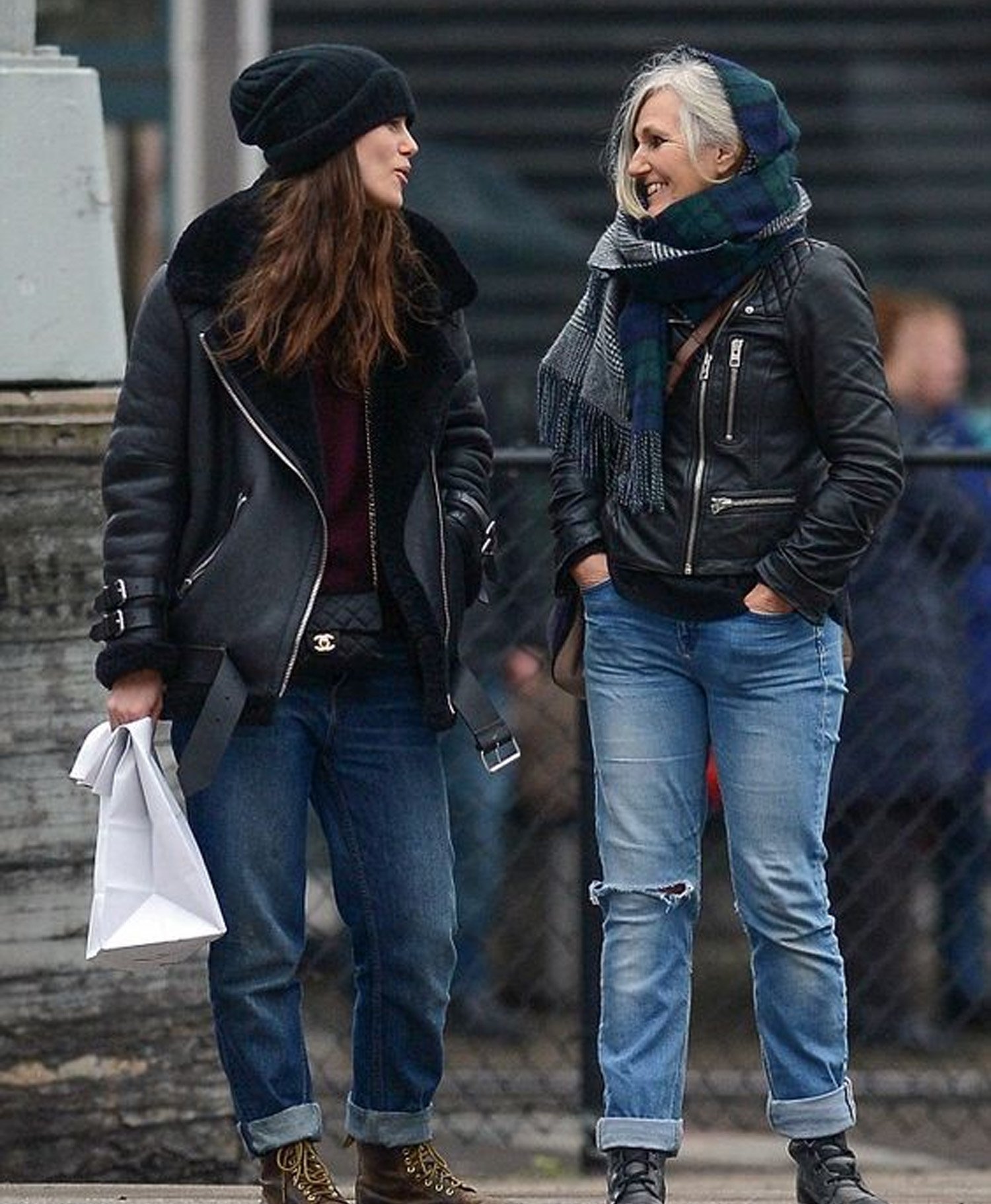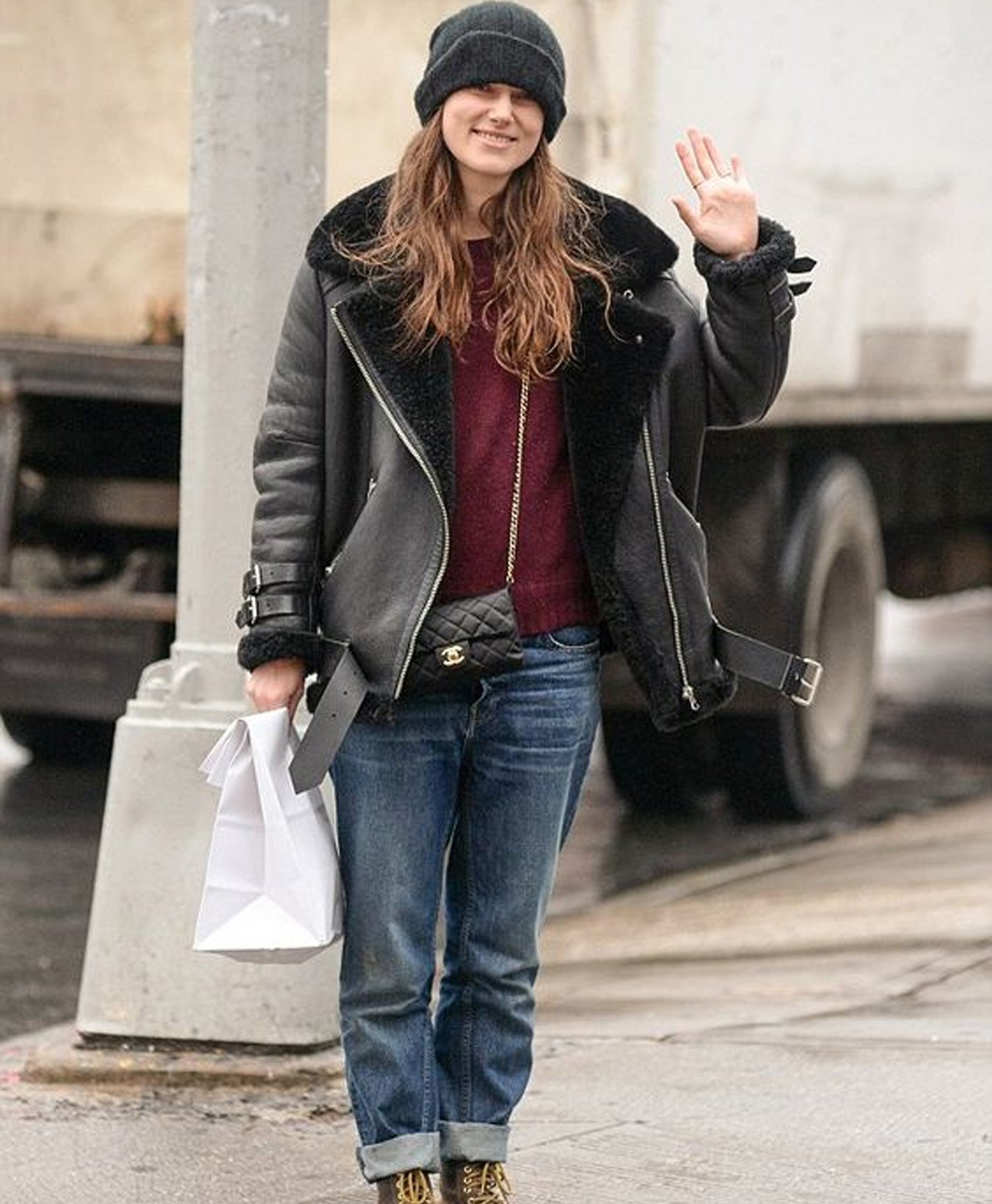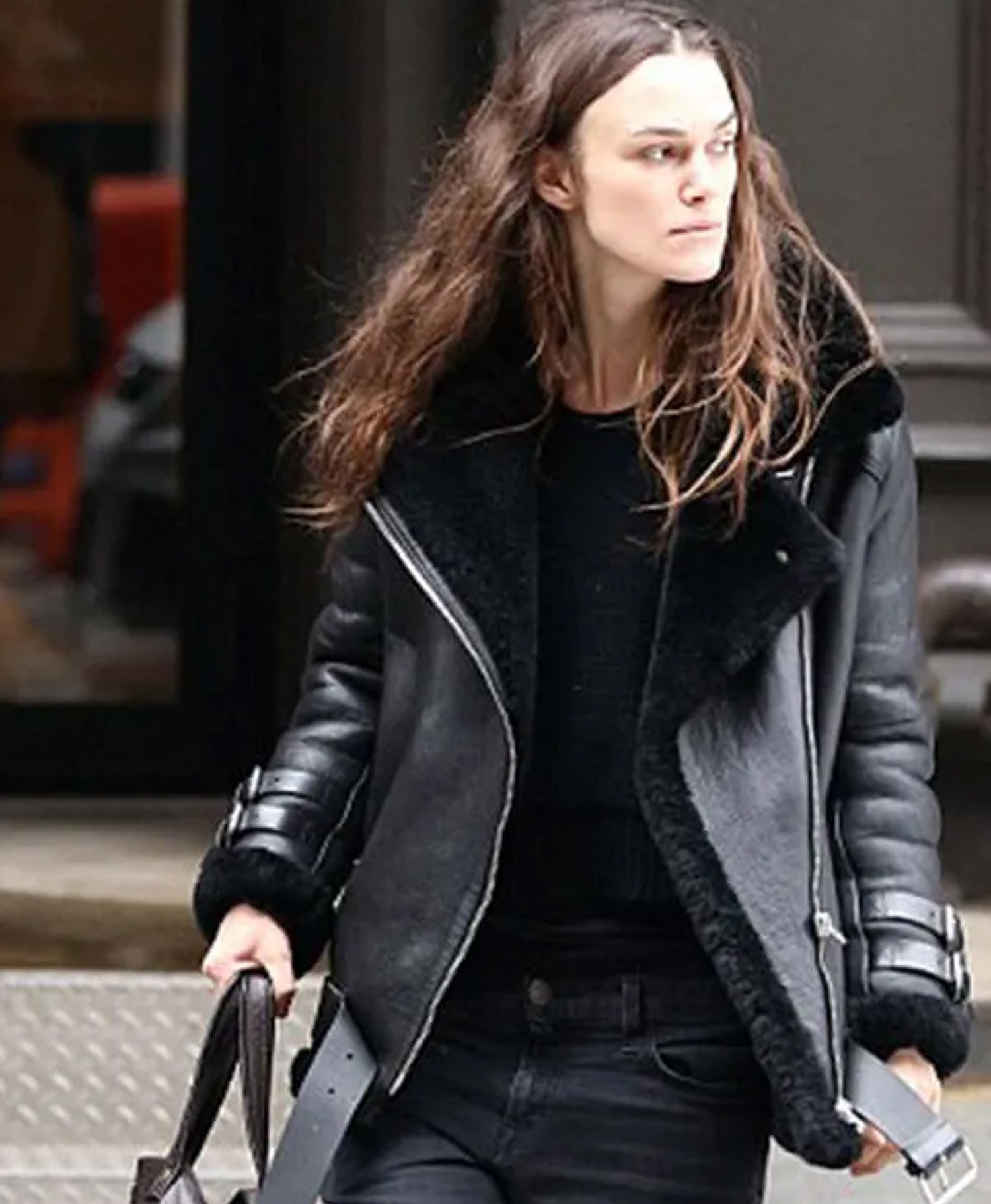 Keira Knightley Black Genuine Shearling Real Leather Jacket