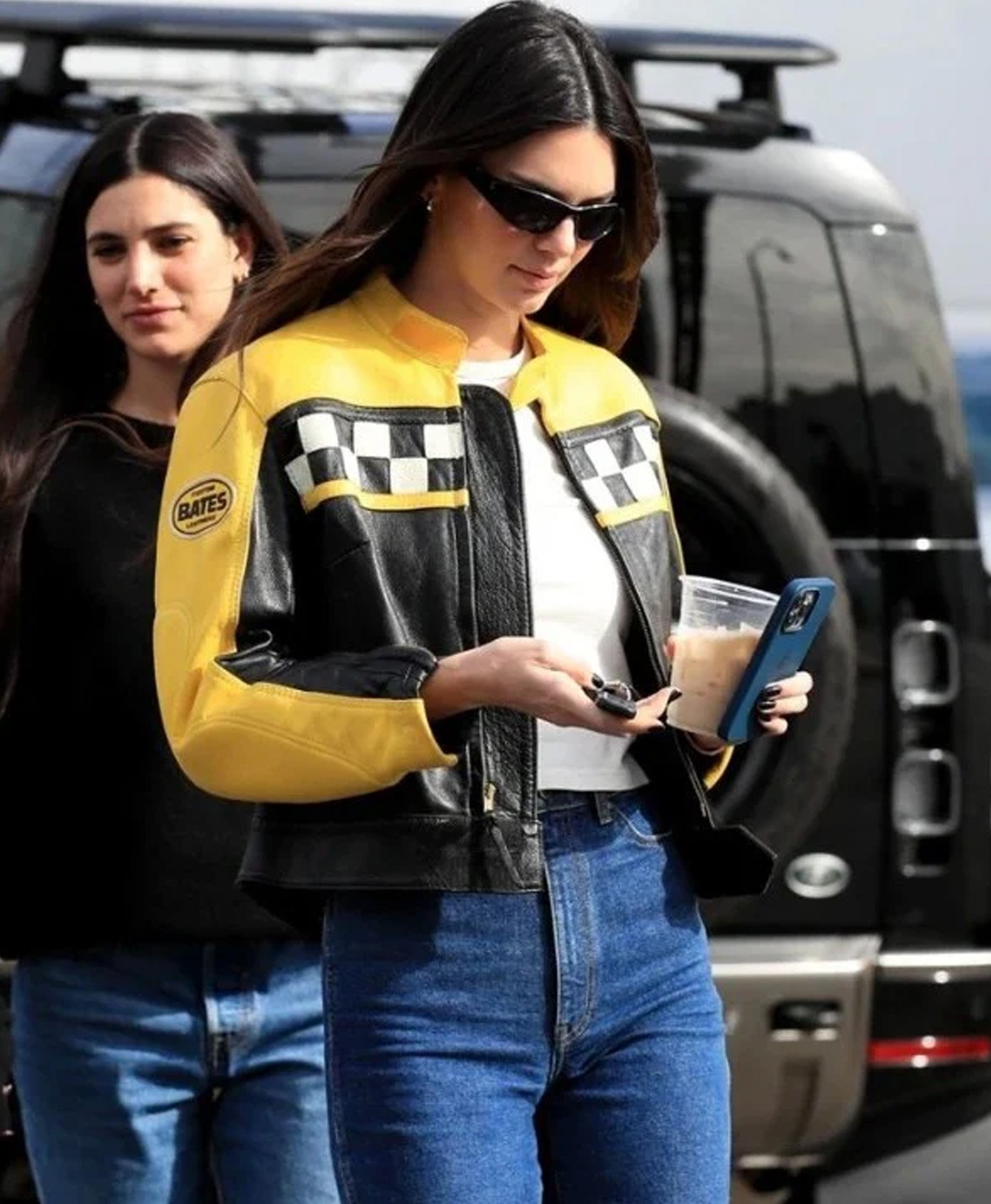 Kendall Jenner Aspen Trip 2023 Black And Yellow Leather Jacket