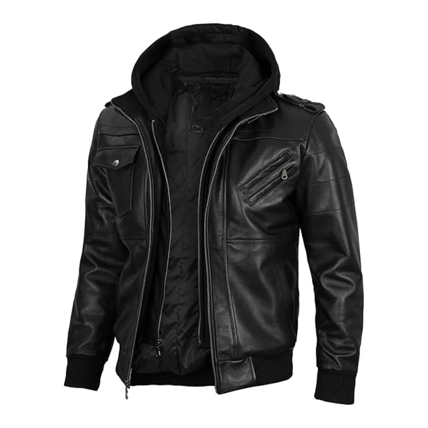 Kevin Hooded Genuine Leather Black Zip-Up Bomber Jacket For Men and Women