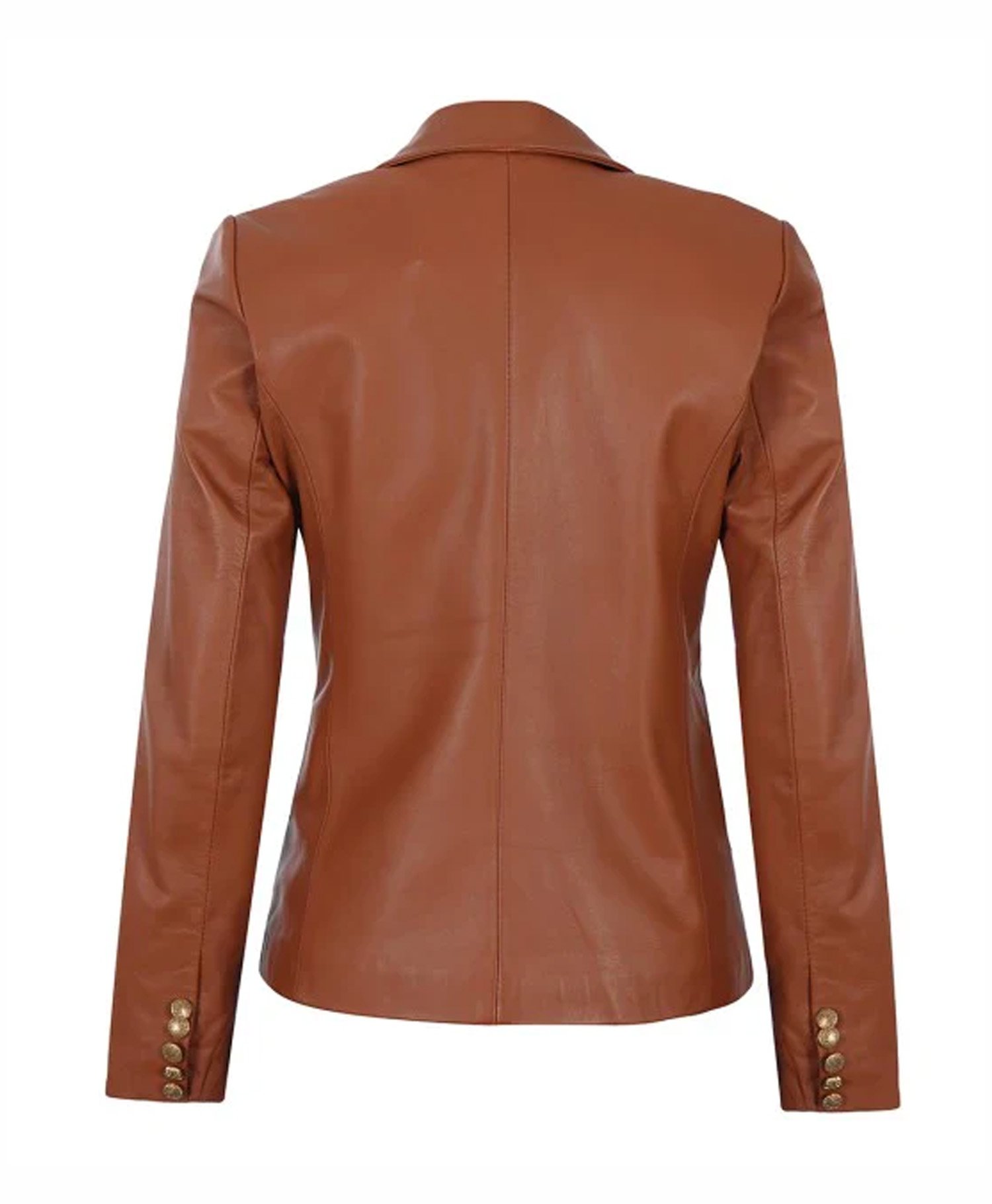 Upgrade your everyday look with the Kinley Women Cognac Leather Blazer Jacket a rich combination of tailored sophistication and buttery smooth real leather. With its warm cognac hue and structured blazer cut, this jacket adds polish to both workwear and weekend ensembles. Whether you’re heading to the office or brunching in the city, the Kinley blazer makes a refined style statement without trying too hard. Made from high quality genuine leather, the Kinley blazer is built for both comfort and durability. Its fitted structure complements feminine curves, while the soft inner lining provides all day wearability. This timeless piece features a single breasted front, sharp lapels, and sleek seams that enhance its modern yet classic silhouette perfect for style lovers in the USA, Canada, and UK. Whether layered over a blouse, dress, or turtleneck, this cognac leather blazer for women by Movie Jackets Hub seamlessly transitions from professional settings to casual affairs. Its versatile color pairs beautifully with neutral tones, denim, or bold prints, making it a wardrobe essential for those who appreciate a mix of fashion and function.