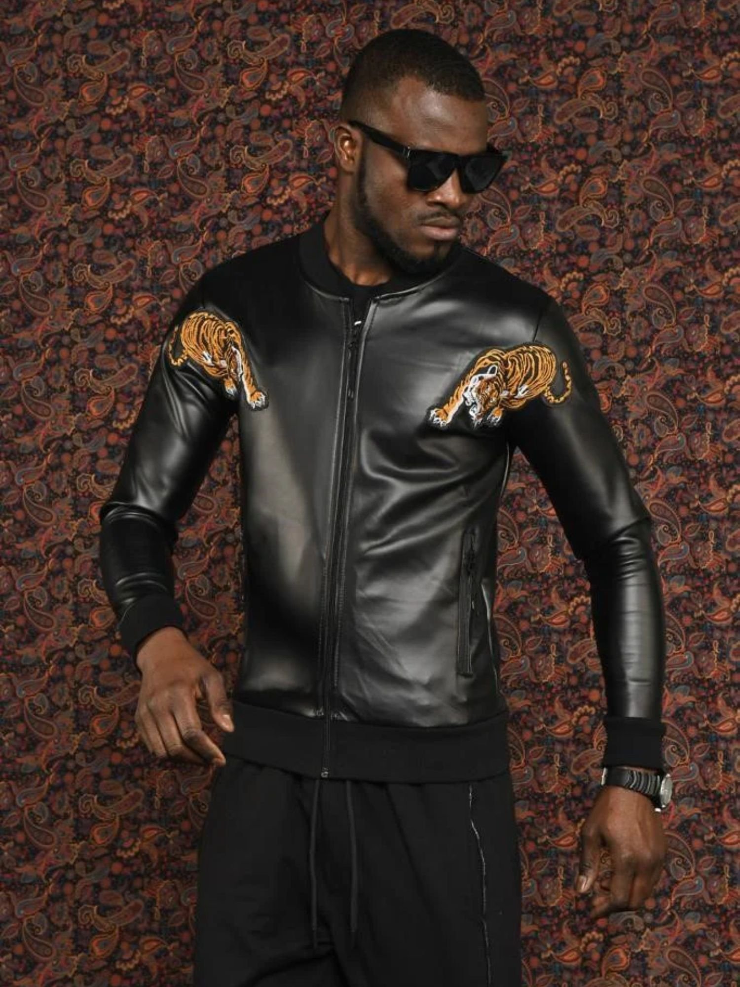 Bold, fearless, and undeniably sharp, The Tiger Bomber is designed for the man who leads the pack. Crafted from high-quality PU Faux Leather, this jacket provides the sleek, rebellious look of traditional leather with a lightweight, modern feel. The centerpiece of this design is the intricate Embroidered Tiger Patch, a symbol of power and energy that sets this jacket apart from standard, plain outerwear.
