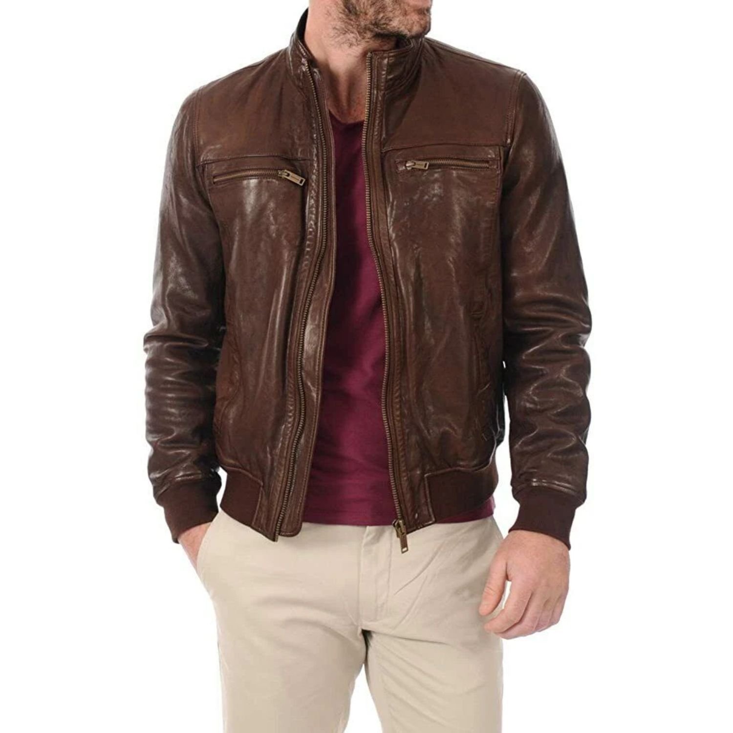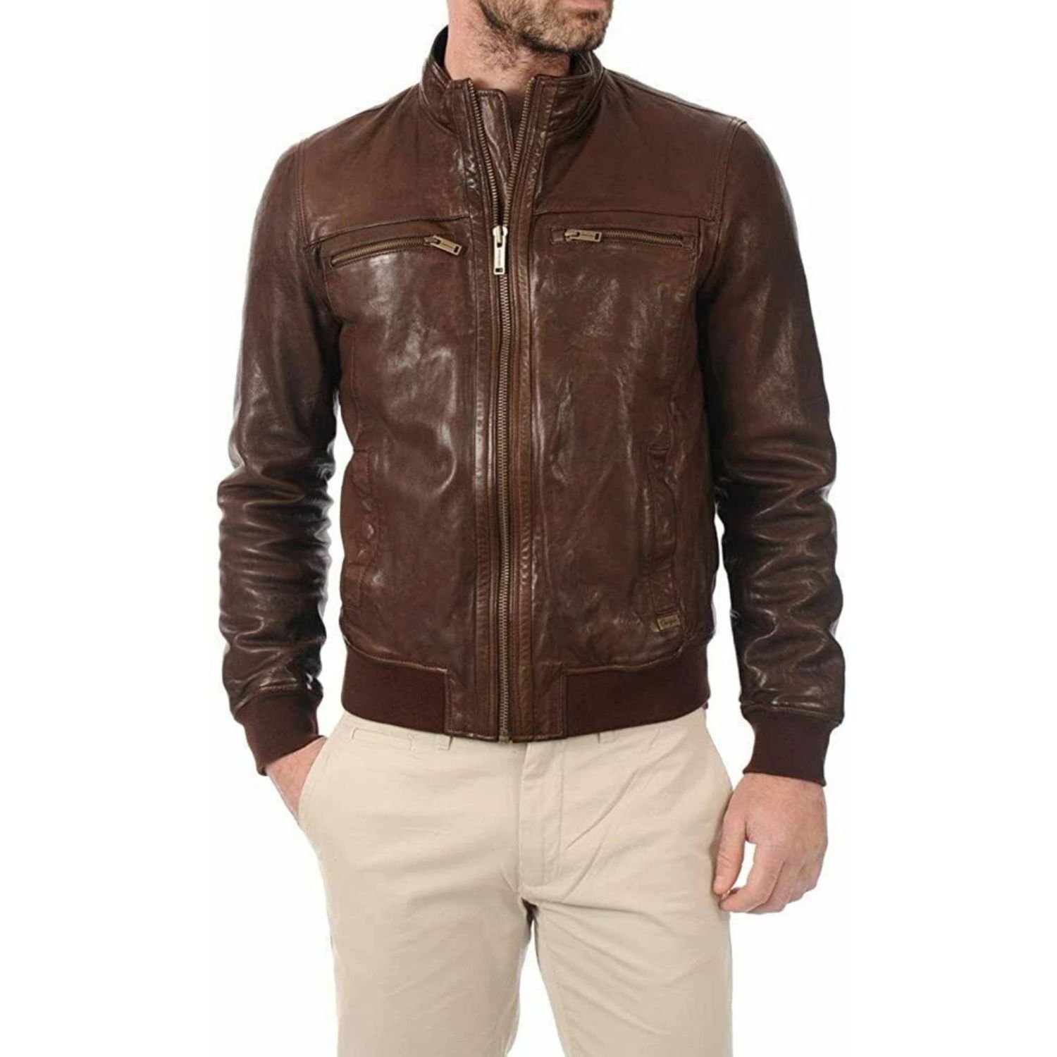 You can get this Biker Brown Leather Jacket Rib Knit Collar at our current discount offer. We’ll deliver a trendy biker moto jacket to the doorstep without any delivery charges with thirty days return policy. If you would like further discounts on the men’s biker jacket, apply coupon code “WJ20” for an additional 20$ OFF.