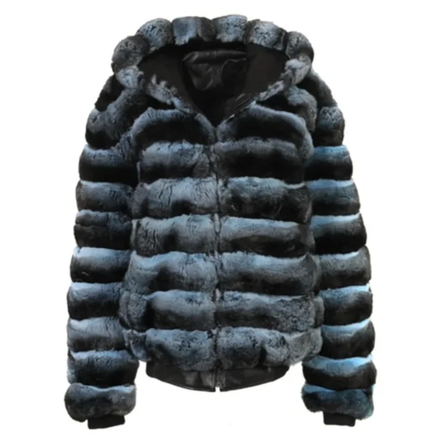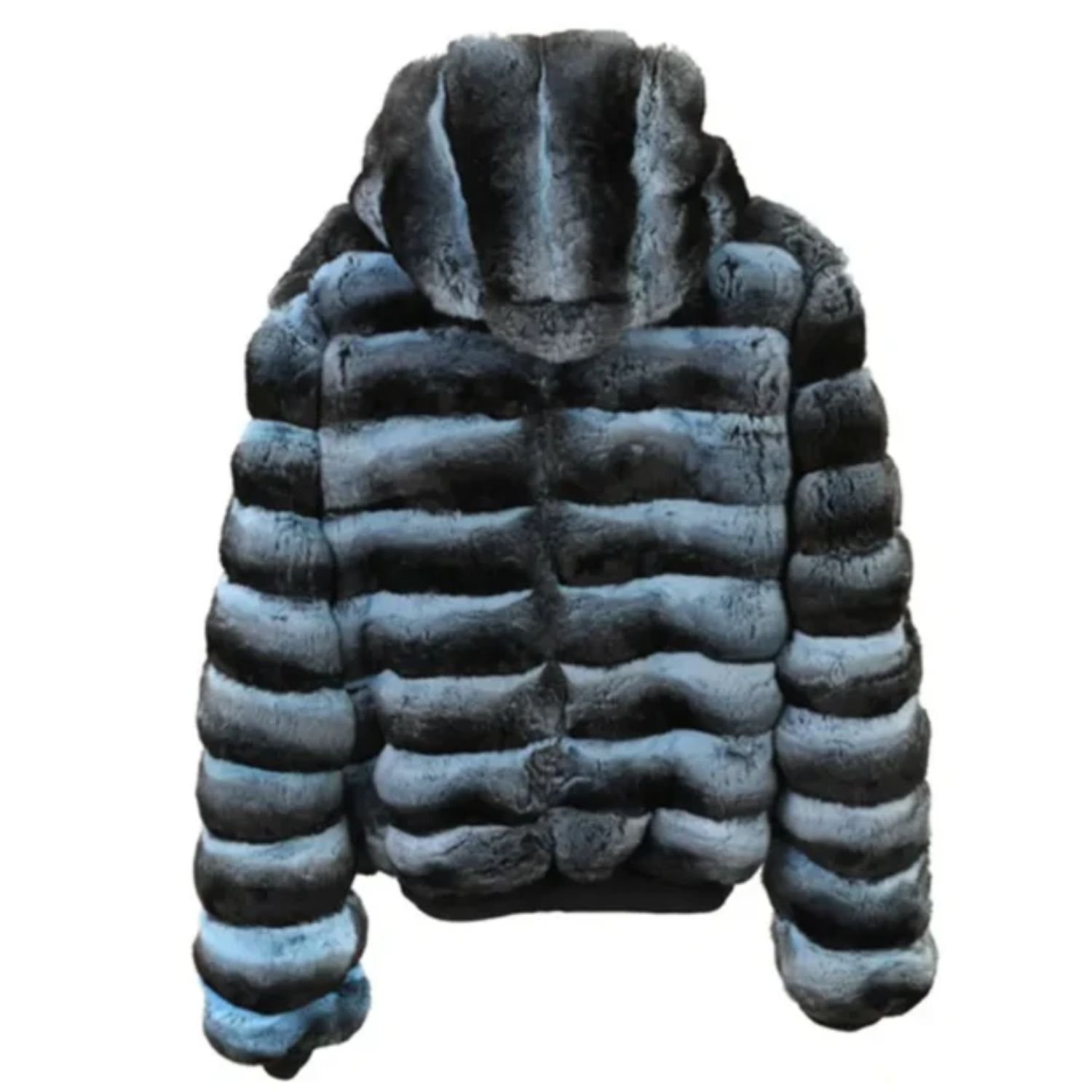 Mens Blue and Black Chinchilla Fur Bomber Jacket With Hood For Winter Season