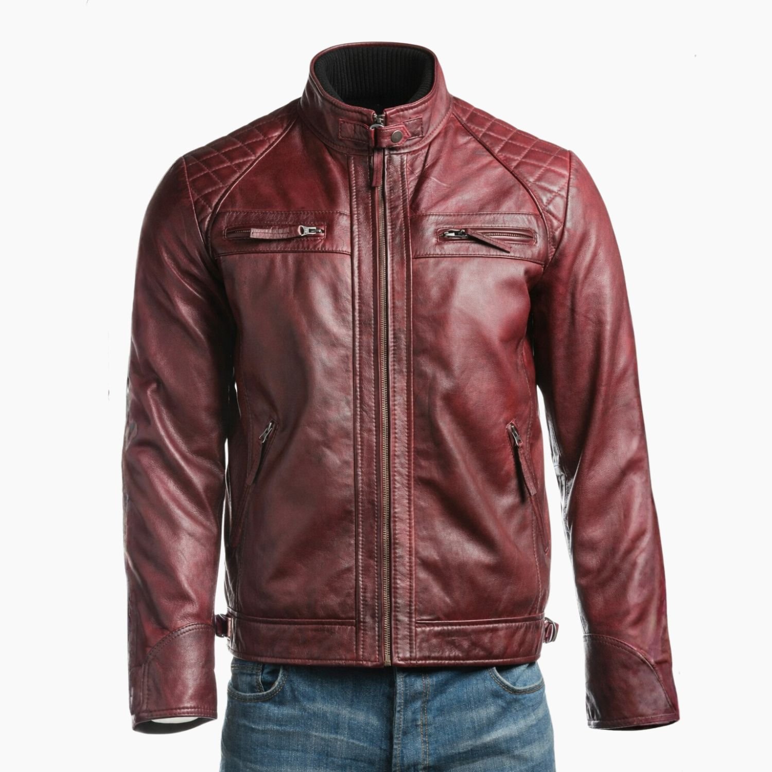 Mens Burgundy Diamond Shoulder Biker Style Leather Jacket