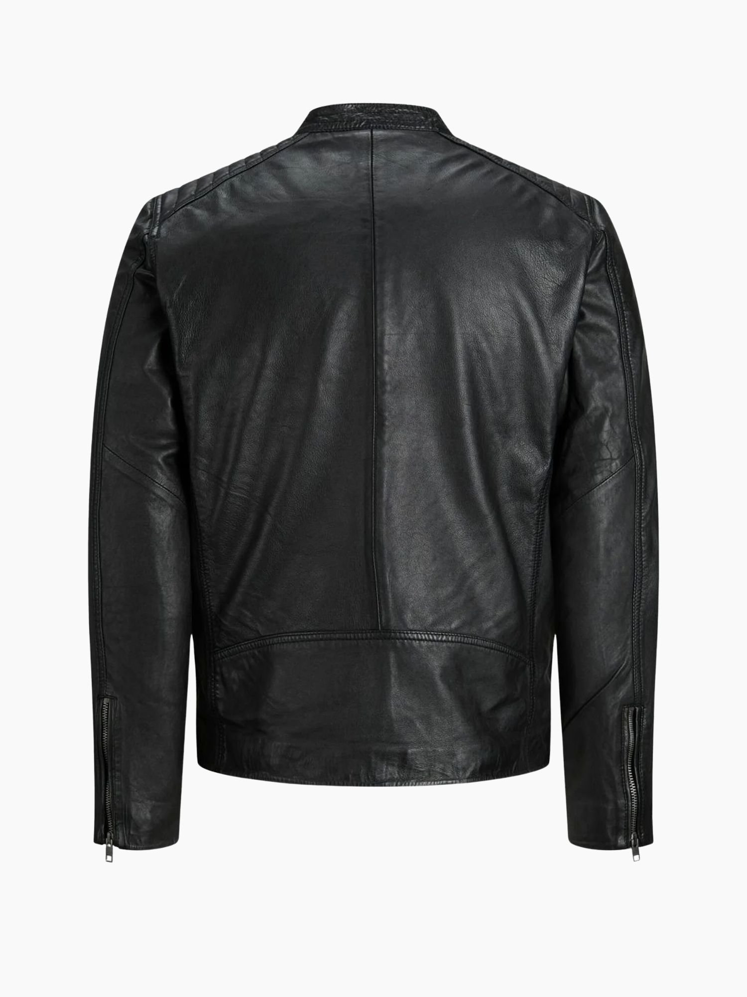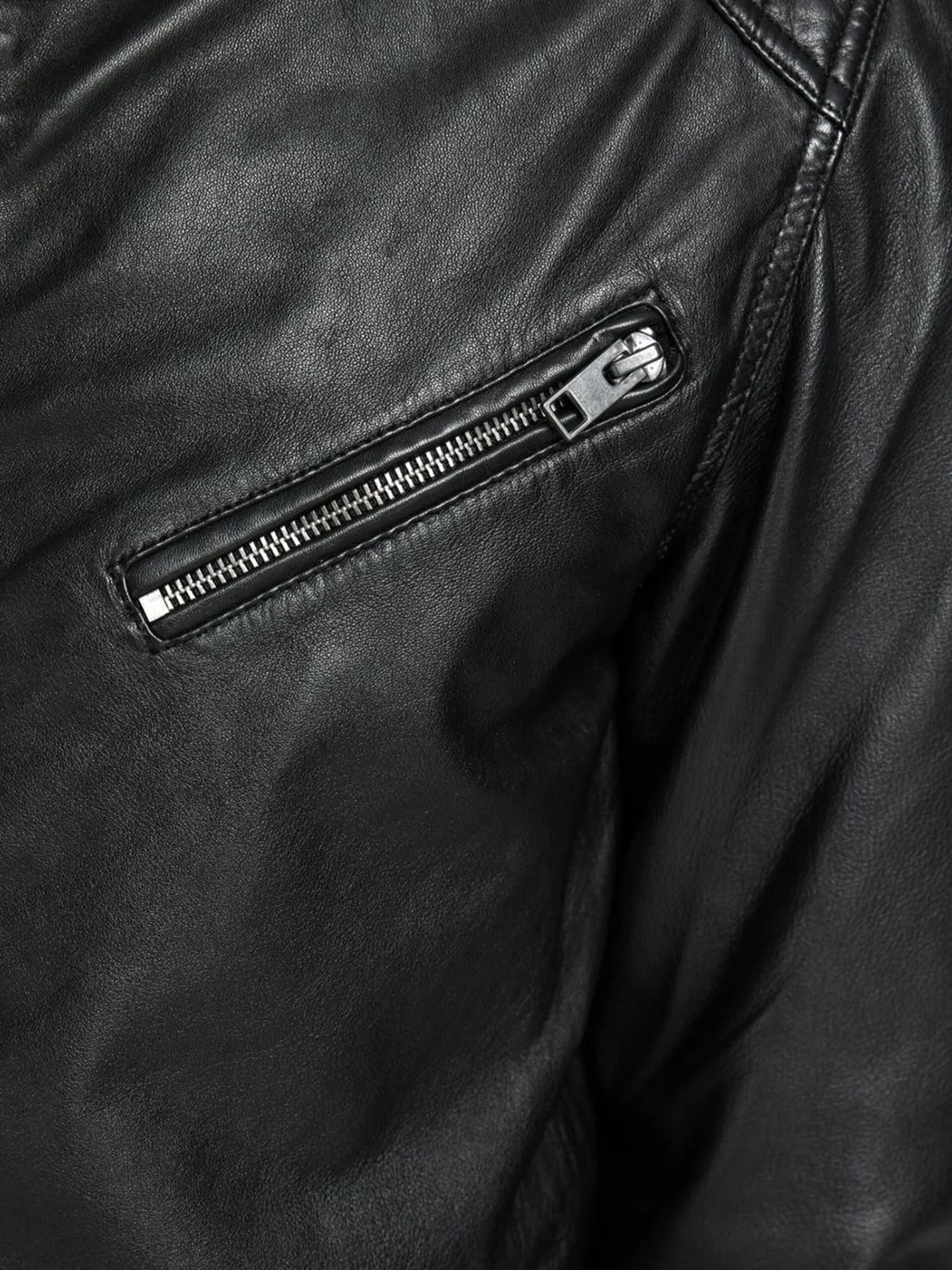 Crafted from high-quality black leather, it features a smooth and durable finish that not only looks sharp but is built to last. The traditional ribbed cuffs, hem, and collar offer a snug fit and help lock in warmth, making it ideal for cooler weather. Its front zip-up closure ensures ease of wear, while the minimalist design keeps the look clean and versatile.