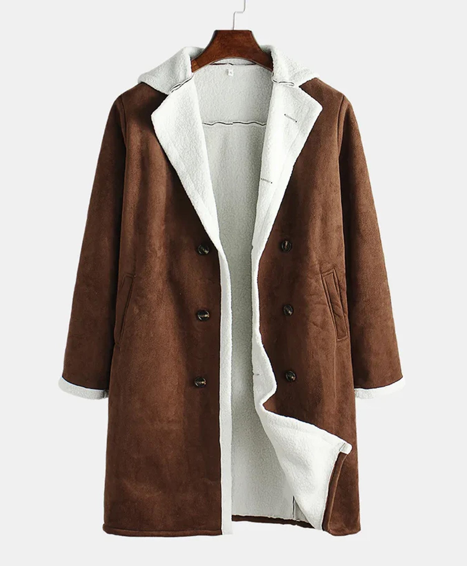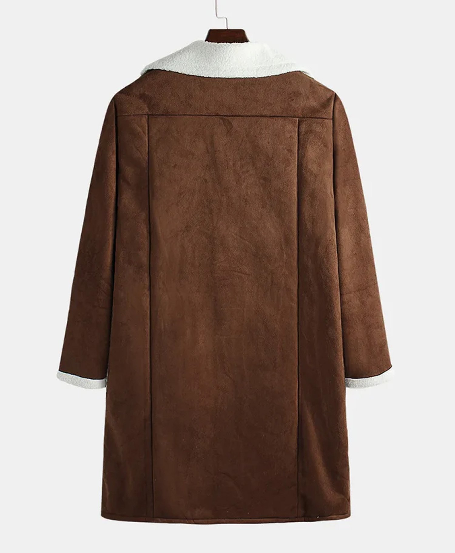 Finished in a rich brown hue, this men’s shearling leather coat by Movie Jackets Hub pairs effortlessly with both formal and casual outfits. Whether worn over a turtleneck or paired with jeans and boots, it’s a wardrobe essential that offers elegance and resilience in equal measure.
