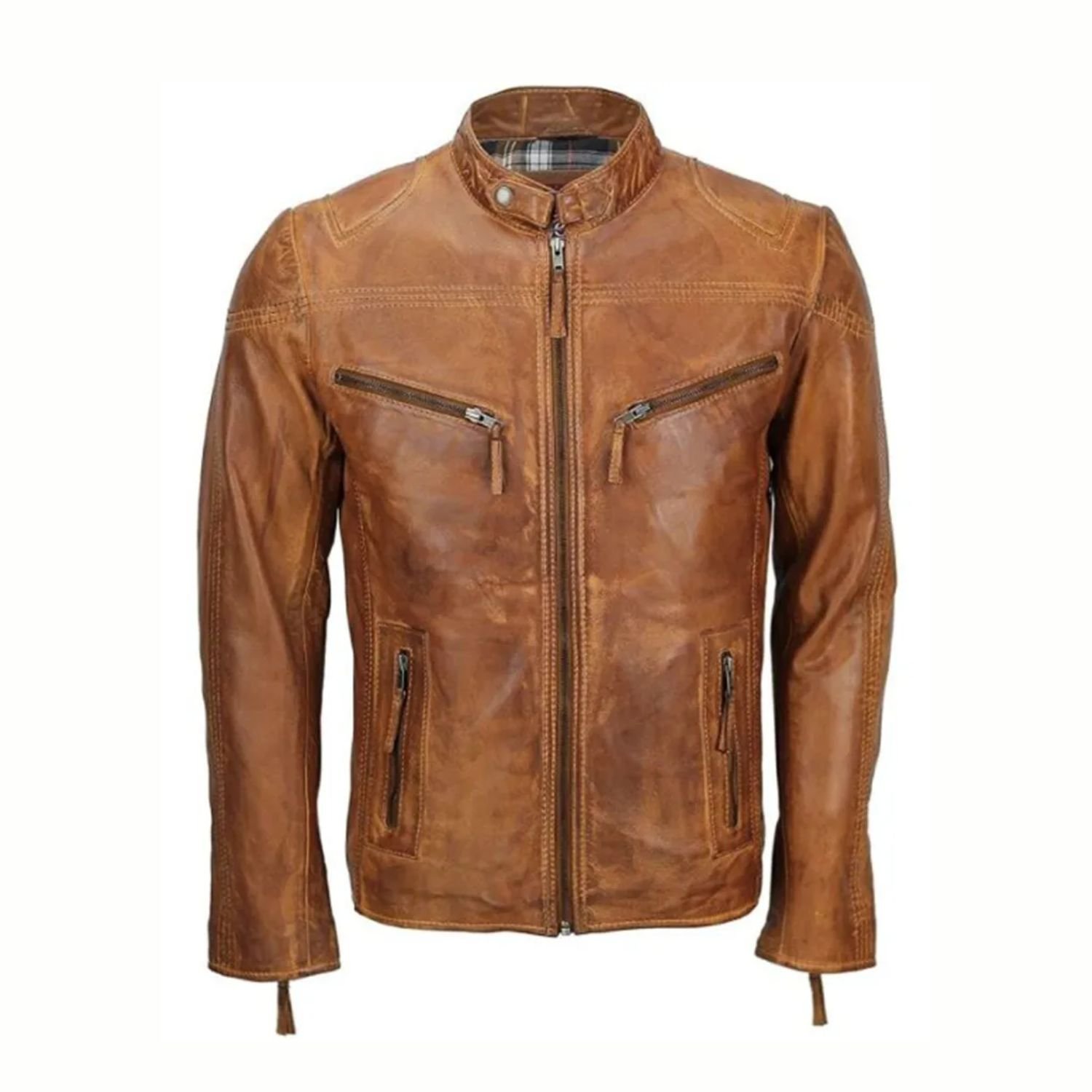 Are you ready for an excursion? Get this current Mens Fitted Tan Brown Biker Jacket and hit the roads with your buddies. Offering solace, toughness, and security. This Jacket is the most fantastic decision for your advanced wardrobe. It has planned with acknowledgeable highlights like the YKK front zipper conclusion, erect collar style, Long Sleeves, and six pockets; two zipper pockets at chests, two zipper pockets at the waist, and two inside pockets. The inward of this real Leather Motorcycle Jacket has connected to give you an additional comfortable and warm affection, making it pleasant to wear in each season.