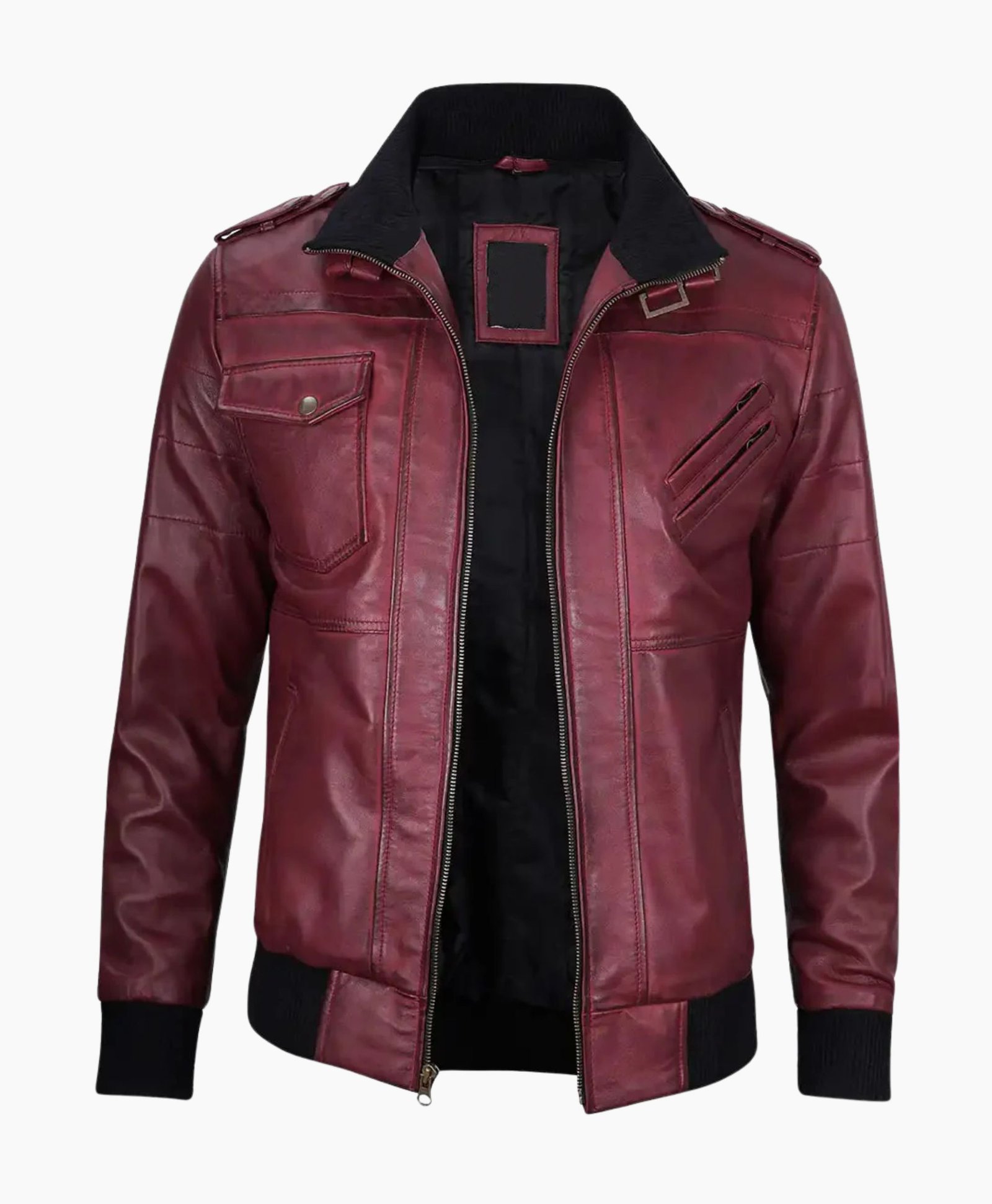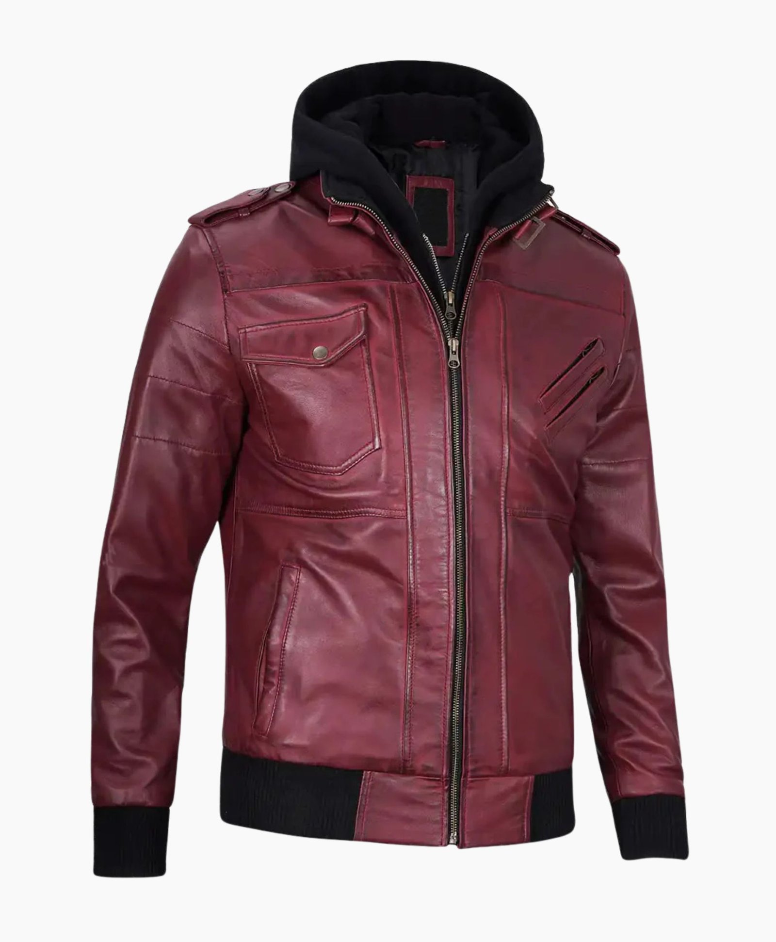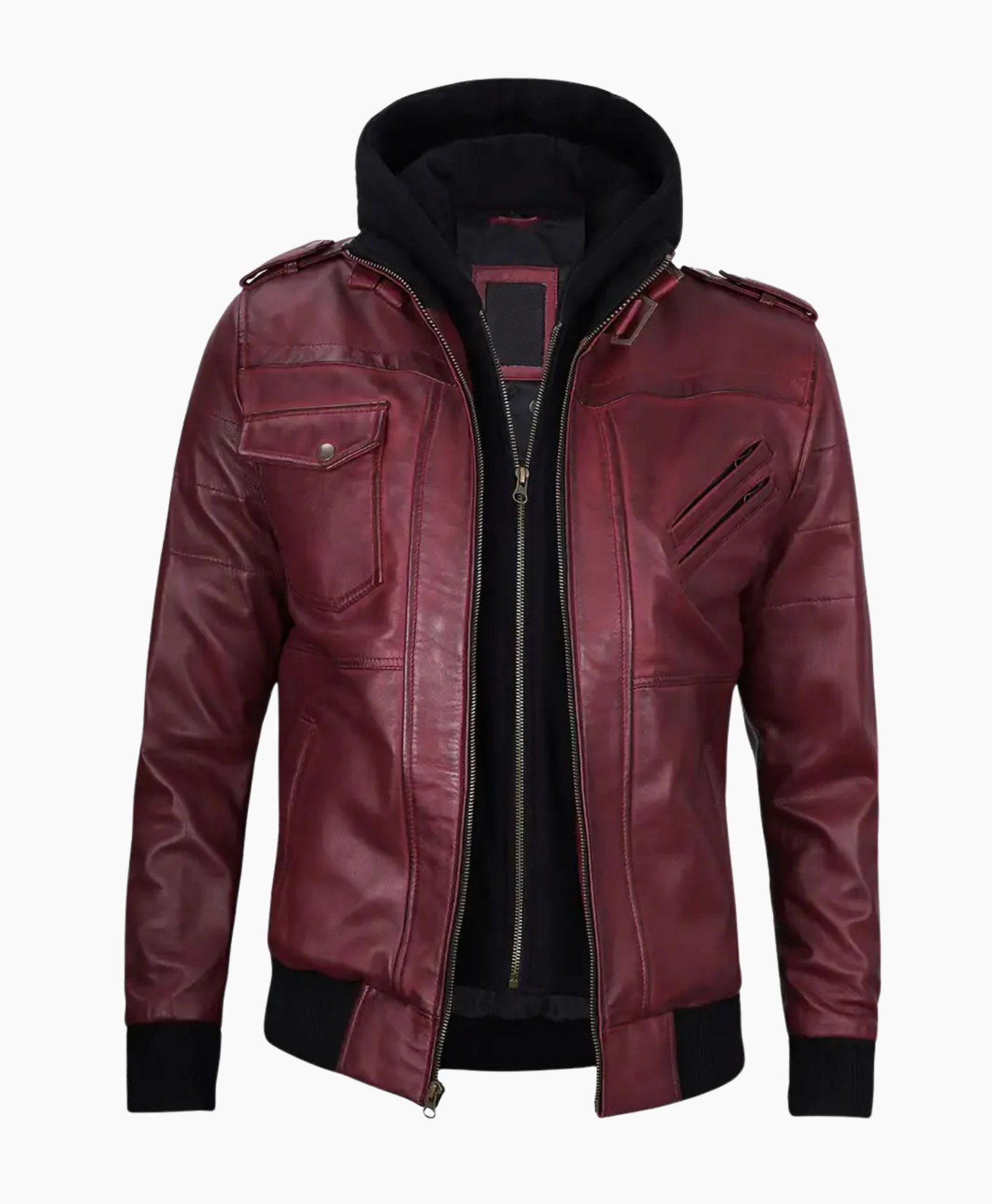 Mens Maroon Leather Jacket with Removable Hood