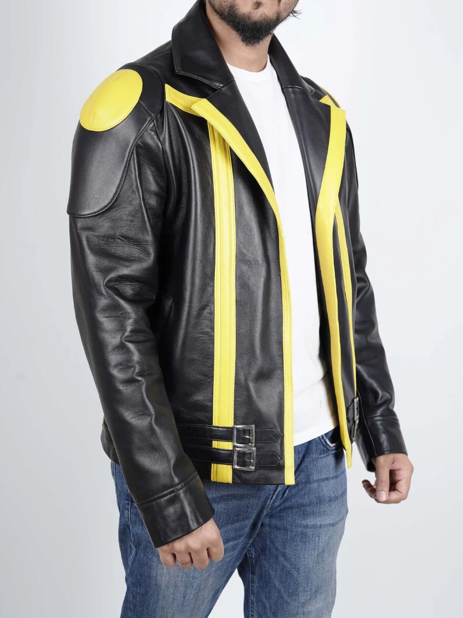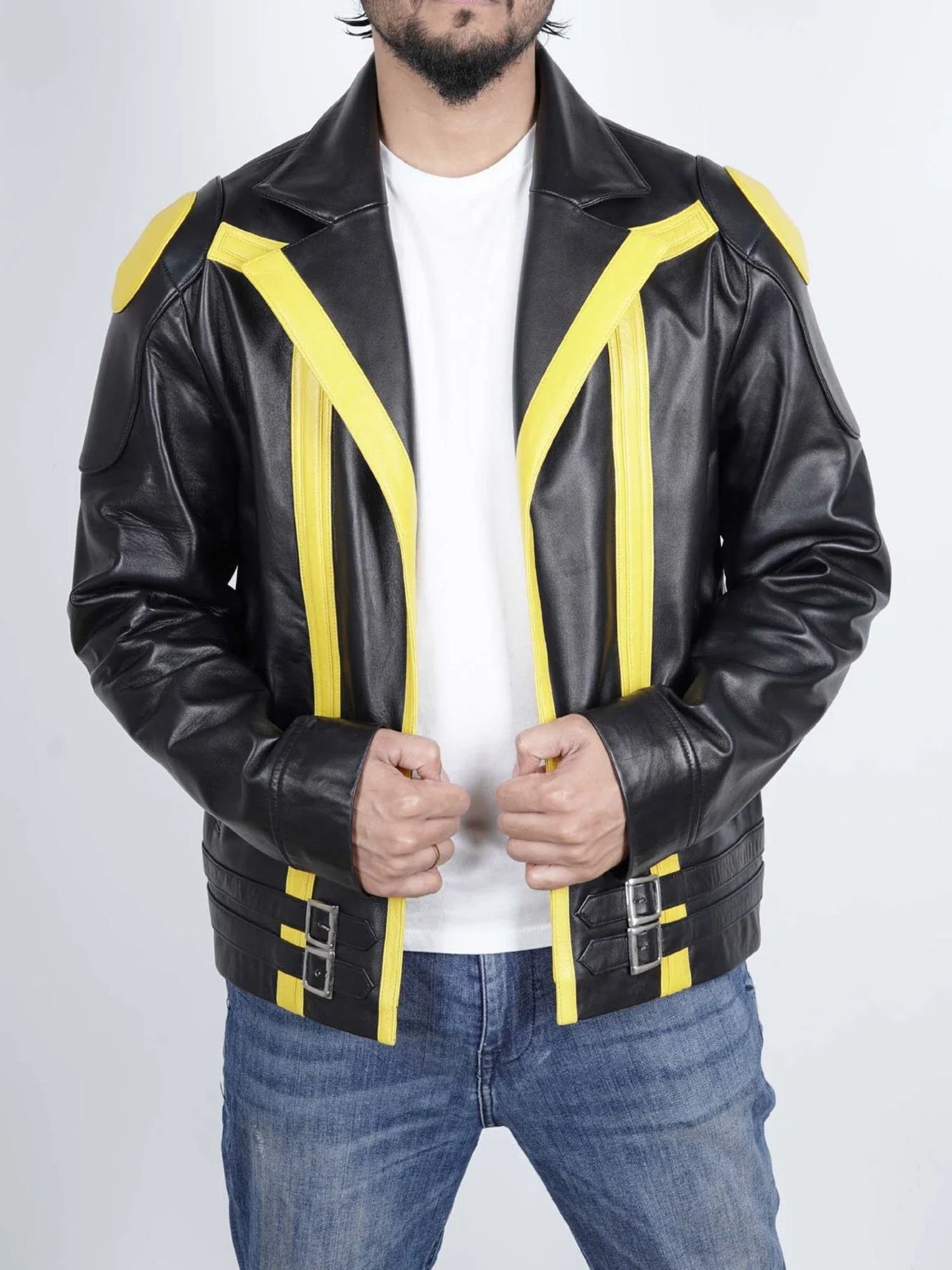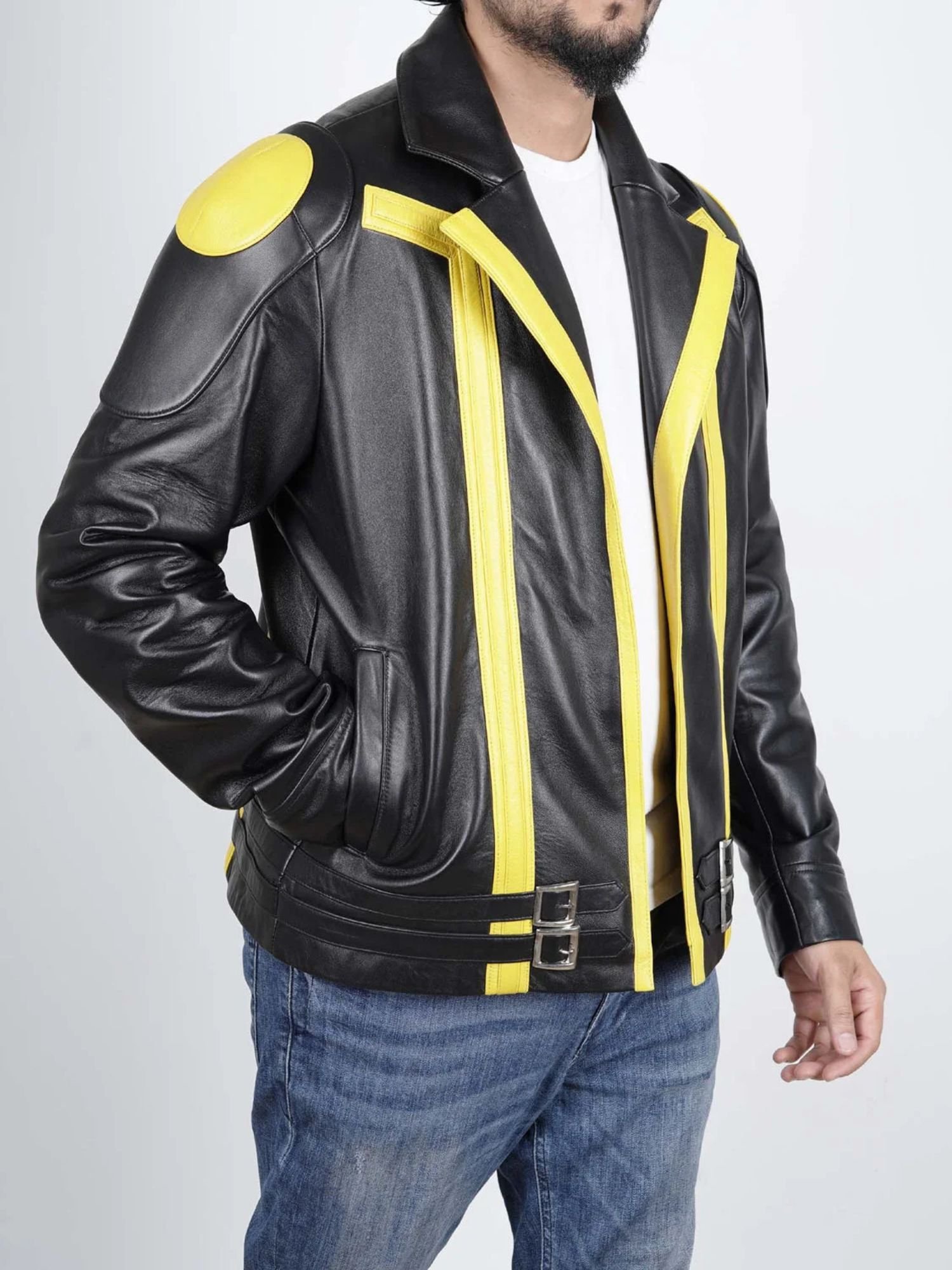 Crafted from high-quality genuine leather, this jacket features a striking yellow and black color scheme that mirrors the iconic look of the beloved character. The sleek front zip closure, stand-up collar, and tailored fit give it a sharp, modern edge, while the detailed stitching and symbolic design elements pay tribute to the game’s adventurous spirit.