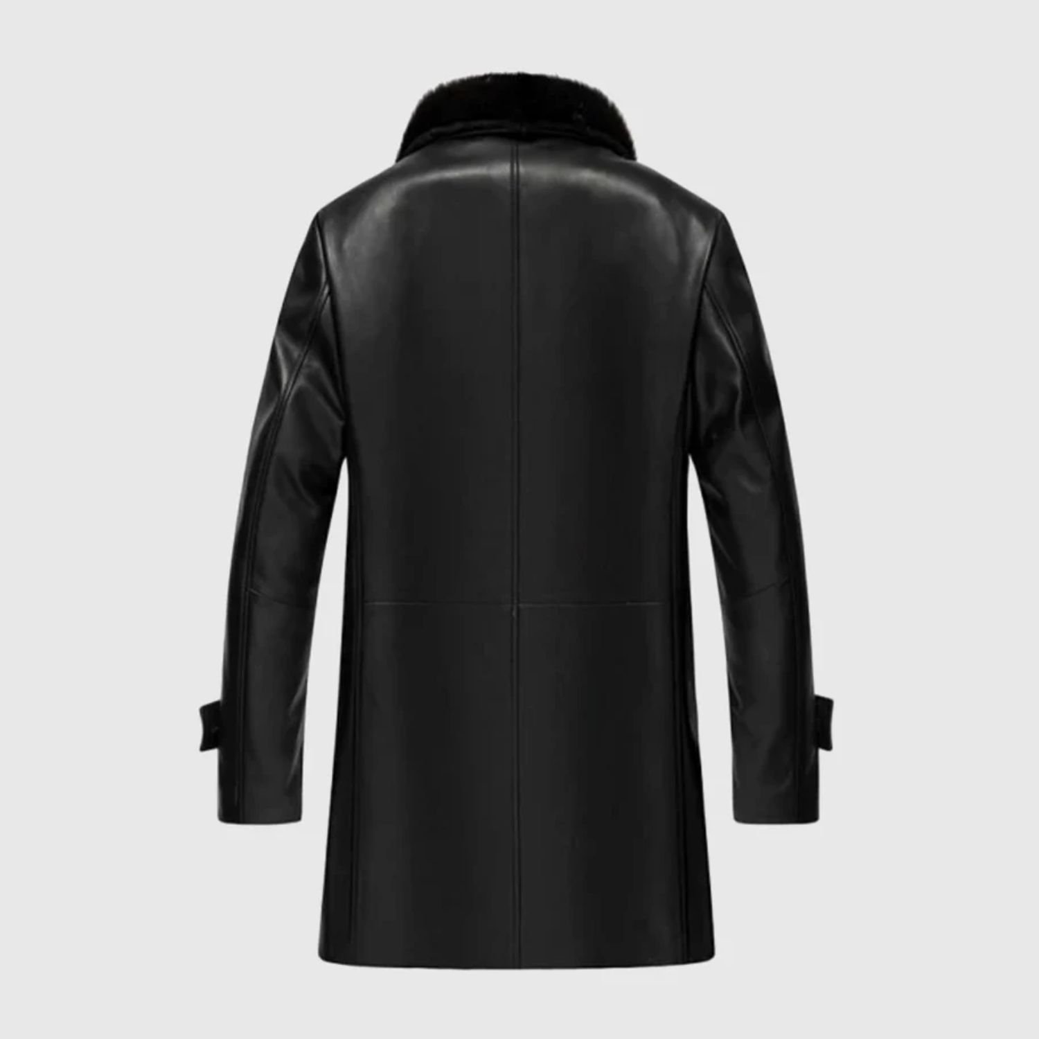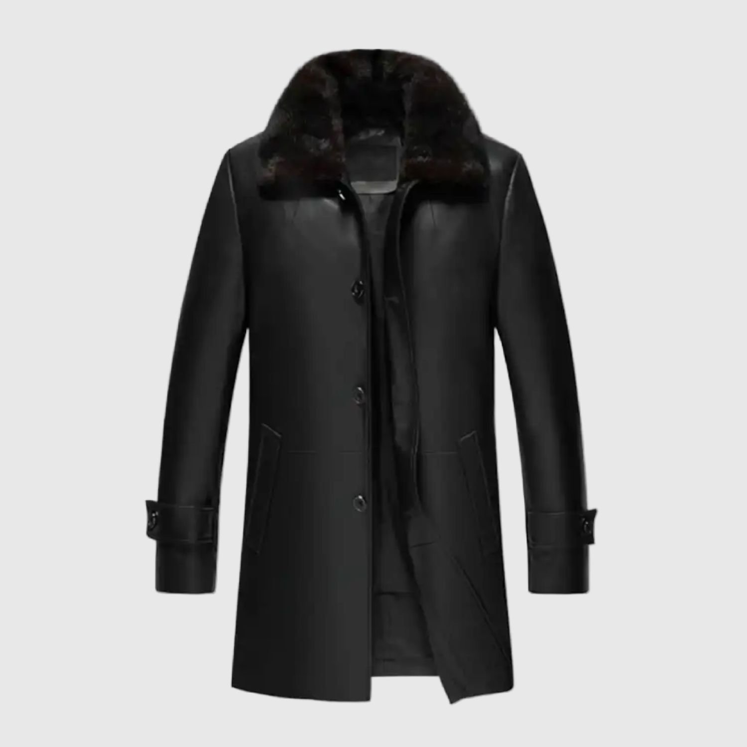 Mens Real Lambskin Leather Black Sherpa Fur Mid Length Trench Coat