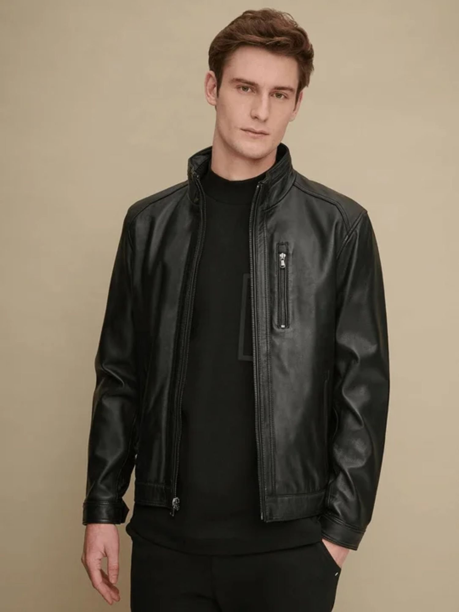 Standard leather is great, but sometimes you need a finish that catches the light and the room’s attention. Our Glossy Black Leather Jacket offers a high-shine, liquid-look texture that brings a futuristic, high-fashion edge to the classic biker silhouette. It’s sleek, it’s bold, and it’s built for the man who isn’t afraid of the spotlight.