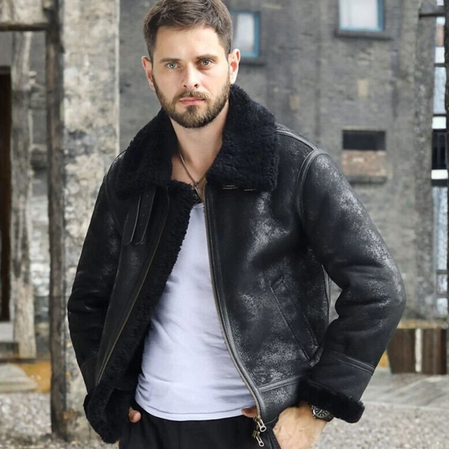 Mens Winter Style Black Snuff Faux Fur Real Leather Jacket