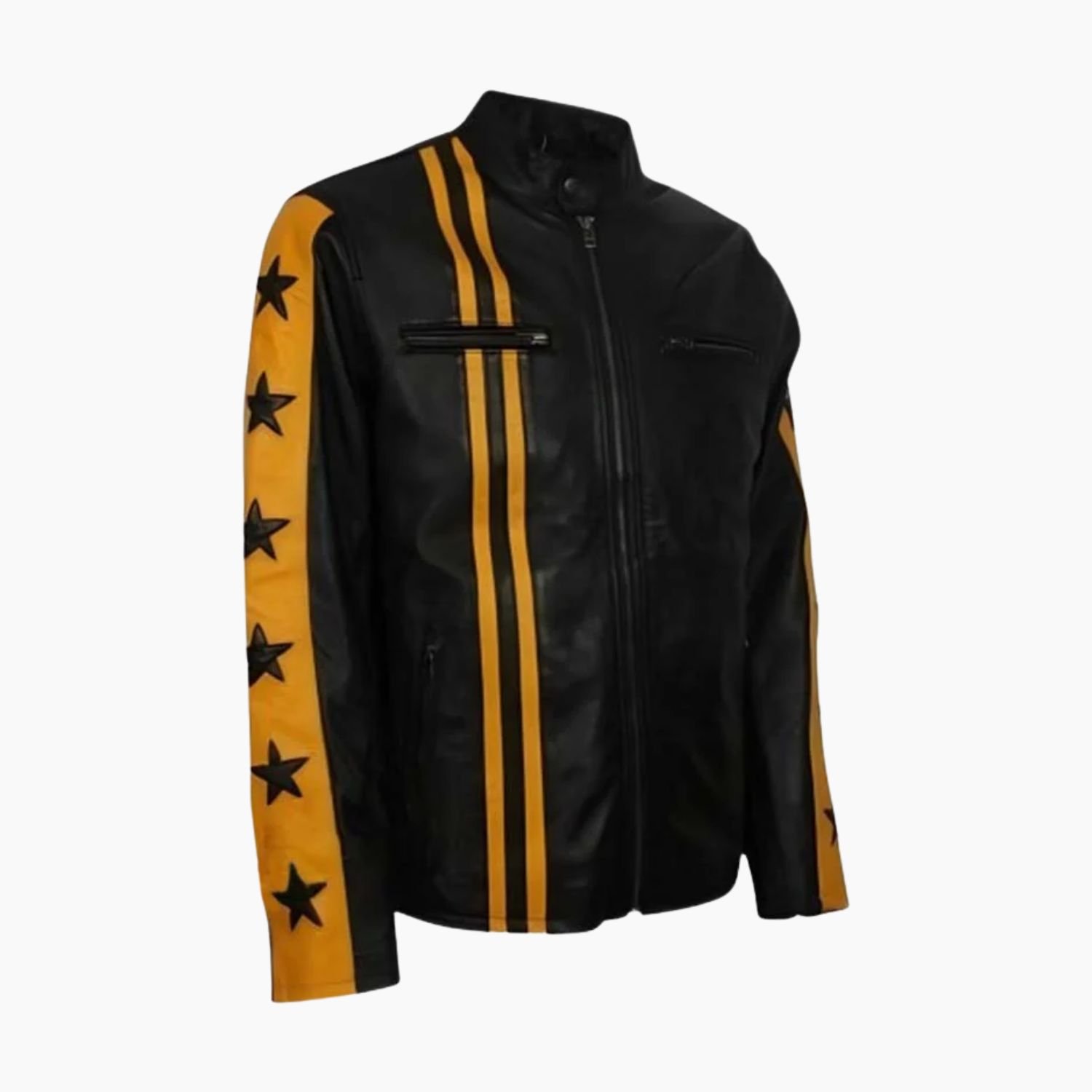 In the world of cafe racers, there are those who follow the pack and those who lead it. The Yellow and Black Star Racer is for the latter. Crafted from Premium Genuine Leather with a high-octane Glossy Finish, this jacket captures the light and the attention of everyone in the room. The striking yellow-on-black contrast is heightened by a unique Star Pattern design, giving it a “pro-circuit” look that feels both heroic and rebellious.